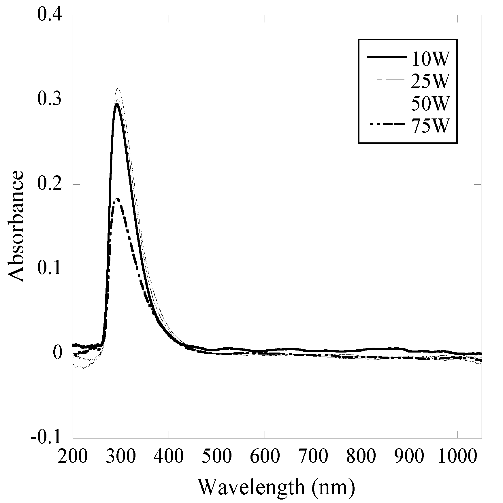 The effect of changing the RF power level on the optical constants of pp–GT polymer thin films has been studied using VASE and UV-Vis spectroscopy over the wavelength range of 200–1000 nm. UV-Vis absorption spectrums of samples fabricated at 10, 25, 50, and 75 W RF power level (Figure 3) reveal that the absorption contour is replicable over the RF power range employed during fabrication. Reallocating of the peak position and/or broadening of the peak are not observed with increase in RF power, unlike other studies [31]. The maximum absorption of pp–GT films fabricated at different RF power levels is found to be at 300 nm. It is believed that the main absorption peak may be the result of pi–pi * transitions. The optical transparency of the polymer films is confirmed by these spectra as the maximum absorption peaks are outside of the visible region of the spectrums. The optical transparency of the pp-GT film can be effectively used in applications such OPV, medical imaging, optical sensor and as an encapsulating (protective) layer for the electronic circuits.