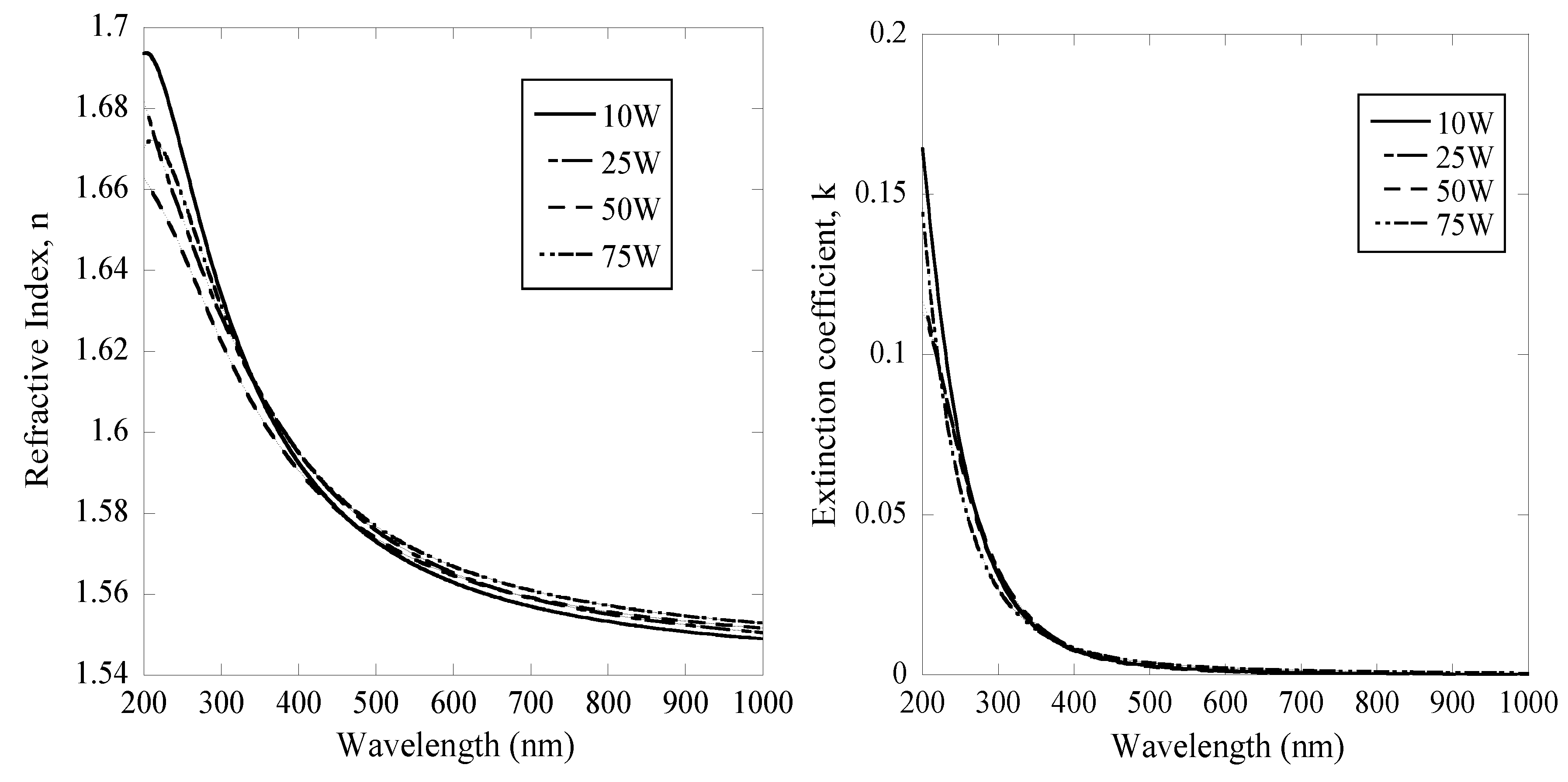 Figure 4 demonstrates the n and k profiles of pp–GT thin films fabricated at various power levels. Thickness and surface roughness parameters from Cauchy analysis (WVASE software) were used to obtain n and k profiles. Mean squared error (MSE) values used to assess the quality of the modeling fit were below 3. Considering the profiles, it is observed that the overall shape of the curves was similar across all the samples. At short wavelengths (below 250 nm), a sharp peak in n profile was detected. At wavelengths above approximately 250 nm, an increase in RF input power resulted in higher n values for the polymer. At 500 nm, the difference in refractive index between 10 and 75 W sample is 0.01, corresponding to a change of less than 1% that is similar to thin films fabricated from linalyl acetate [32].