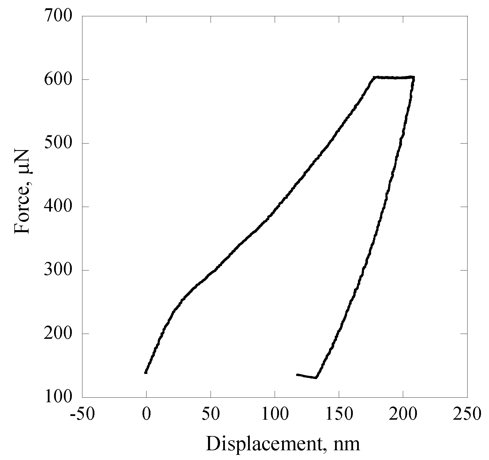 The load-unload curve (Figure 6) shows the typical behavior of pp–GT thin films undergoing a nanoindentation test. The initial slope of the unloading process is used to deduce the reduced elastic modulus of the material at the specific contact depth, hc. There are a number of pop-ins in the curve initially and this phenomenon may be attributed to micro-cracking or dislocation nucleation and/or propagation during loading as have been investigated in a wide variety of materials [46].
