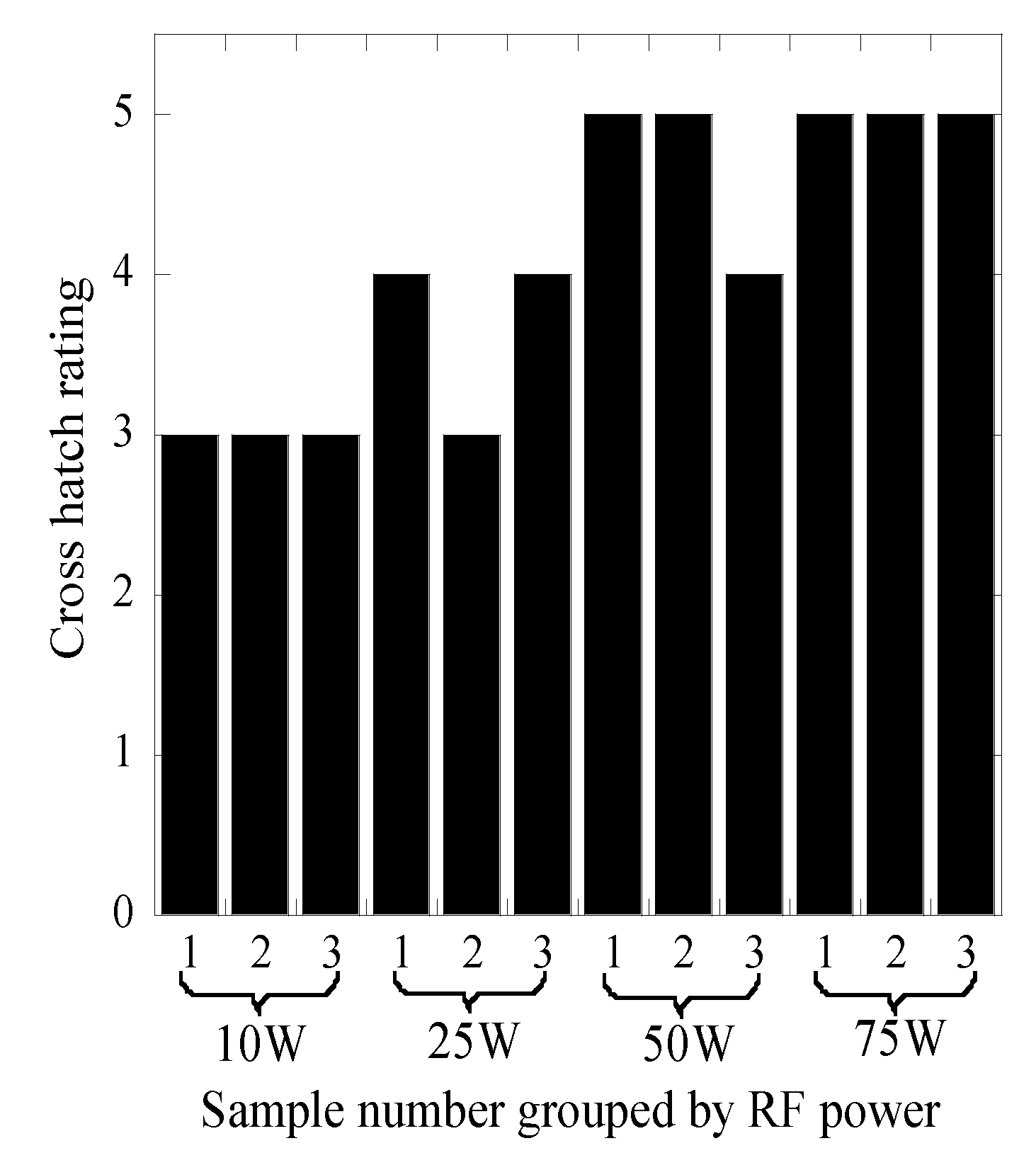 The adhesion behavior of pp–GT thin films deposited on glass is presented in Figure 8. The adhesion improved with higher deposition power. Films fabricated at 10 W showed 5%–15% delamination. However, films fabricated at 50 and 75 W showed no delamination effect with a higher cross hatch rating.