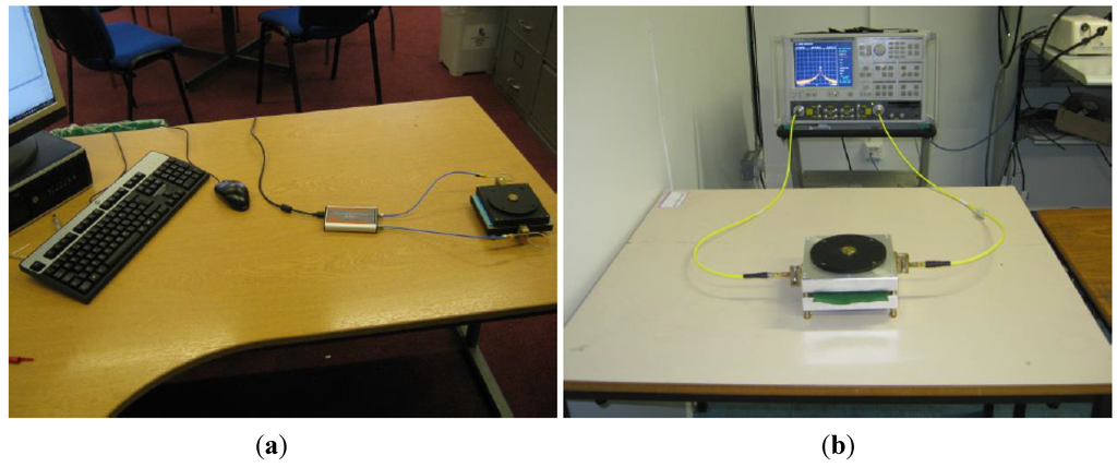 (a) Q-meter measurement setup measuring a piece of felt by using the 1.9 GHz split post resonator; (b) Resonator-Vector Network Analyzer (VNA) setup measuring a piece of felt by using the 1.1 GHz split post resonator.