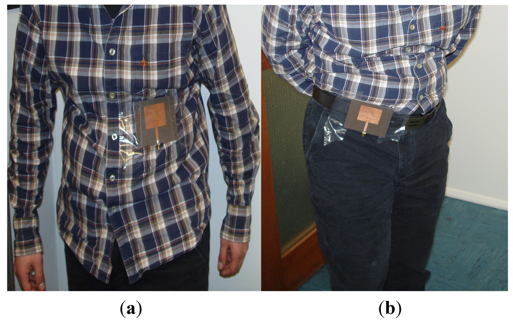 (a) 2.5 GHz patch antenna positioned at the left side of the thorax under the chest; (b) 2.5 GHz patch antenna positioned on the trunk.
