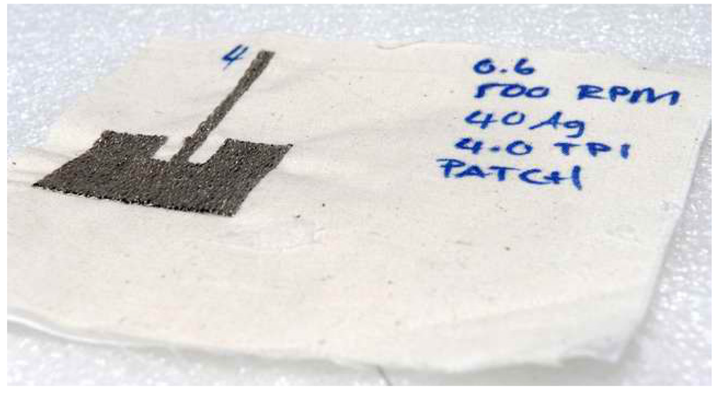 Inkjet and screen printing [50] can also be used to create conducting sections of wearable antennas. However, the substrates are generally paper or Kapton while textiles are not ideal printing substrates. As the name suggests screen printing requires a mask to be made for each design and therefore is less practical for different individual designs [51,52]. RF transmission lines have been previously screen printed onto a cotton substrate [53].