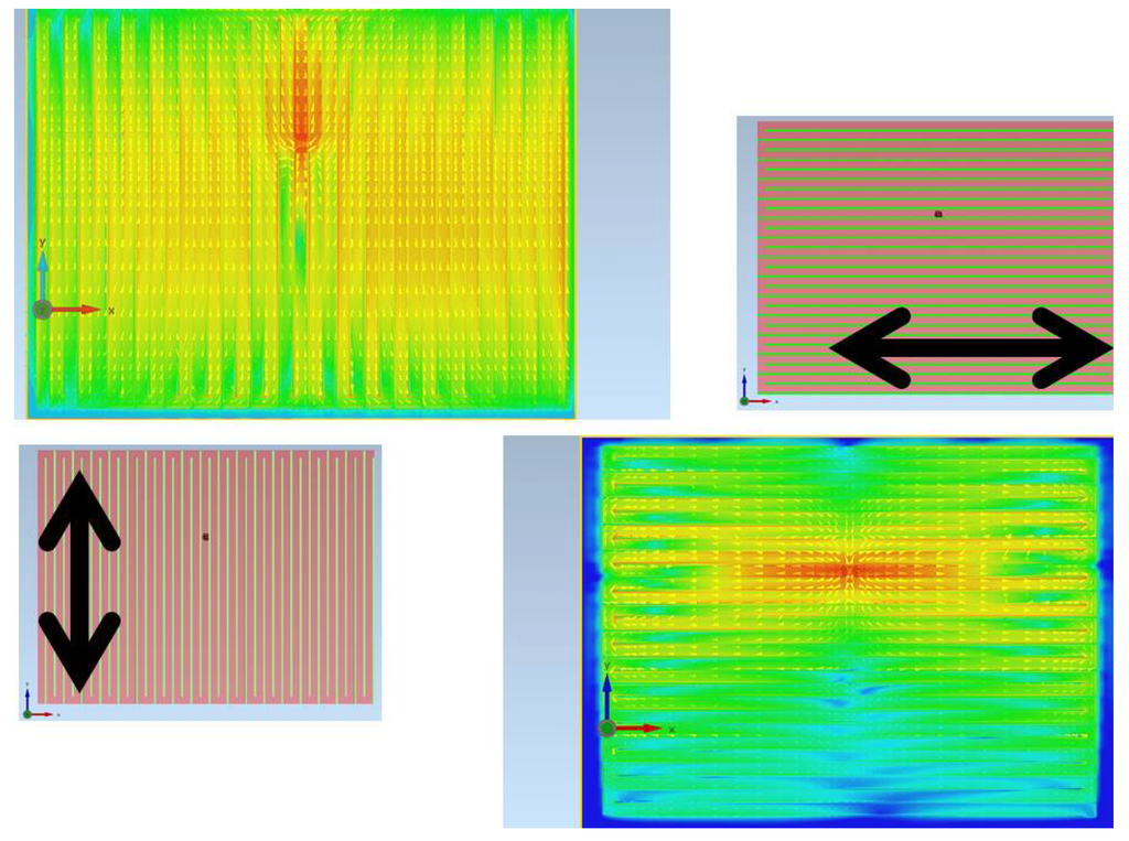 The challenges of fabricating embroidered antennas are outlined in [36]. Such challenges include: selecting the most suitable conductive thread in terms of conductivity; strength; flexibility and the assessment of the behavior of the conductive threads when they are stitched to form an approximately continuous object so as to improve the efficiency of the patch antenna [36]. The effect of the stitch direction and stitch density on the performance of the antenna has been extensively studied and described in [37]. The understanding of the current flow on a designed patch antenna is a fundamental requirement to choose the stitch direction (Figure 8). Higher antenna efficiencies can be obtained by ensuring the principle current flow is parallel to the stitch direction. This can lead to further challenges when the design is required to also work at higher modes where the current is in the perpendicular direction and for more complicated designs where the current flows in different directions.