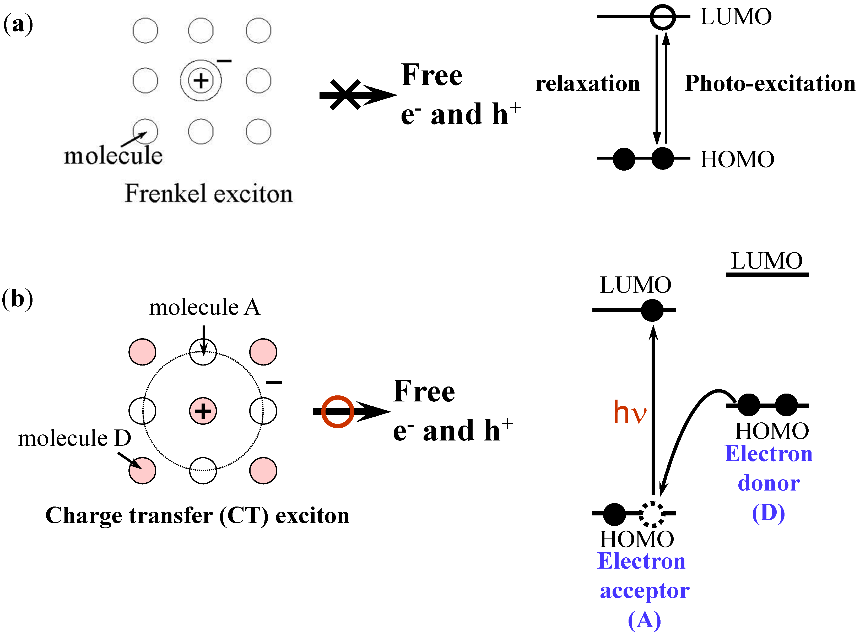Carrier generation in organic semiconductors. (a) Single molecular solids; (b) Donor (D)/acceptor (A) sensitization of carrier generation by the mixing of two kinds of organic semiconductor molecules. Efficient free carrier generation occurs from the charge transfer (CT) exciton.