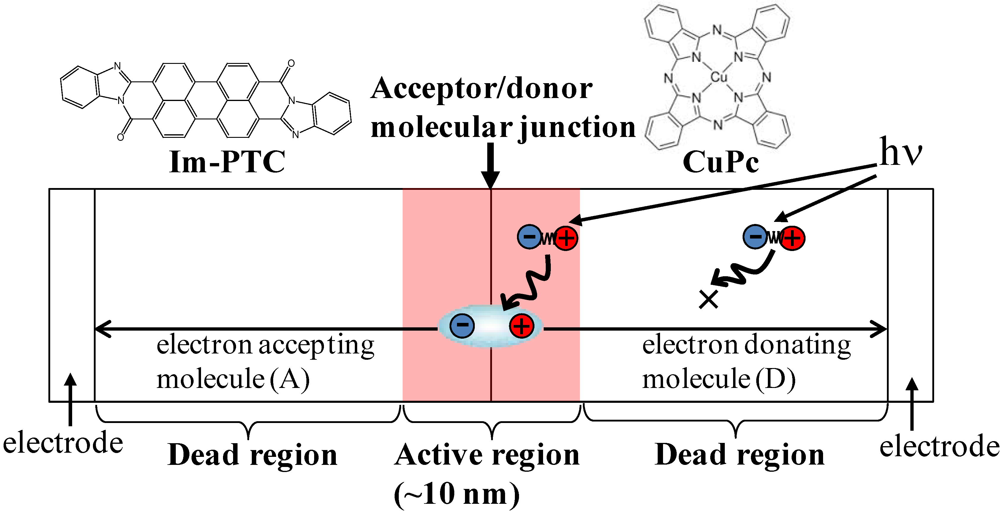 Schematic illustration of a two-layer cell composed of perylene pigment (Im-PTC) acting as an acceptor molecule (A) and copper phthalocyanine (CuPc) acting as a donor molecule (D). Photocurrent is generated only in the active region (shaded red) close to the heterojunction and all other parts of organic films act as a dead region.