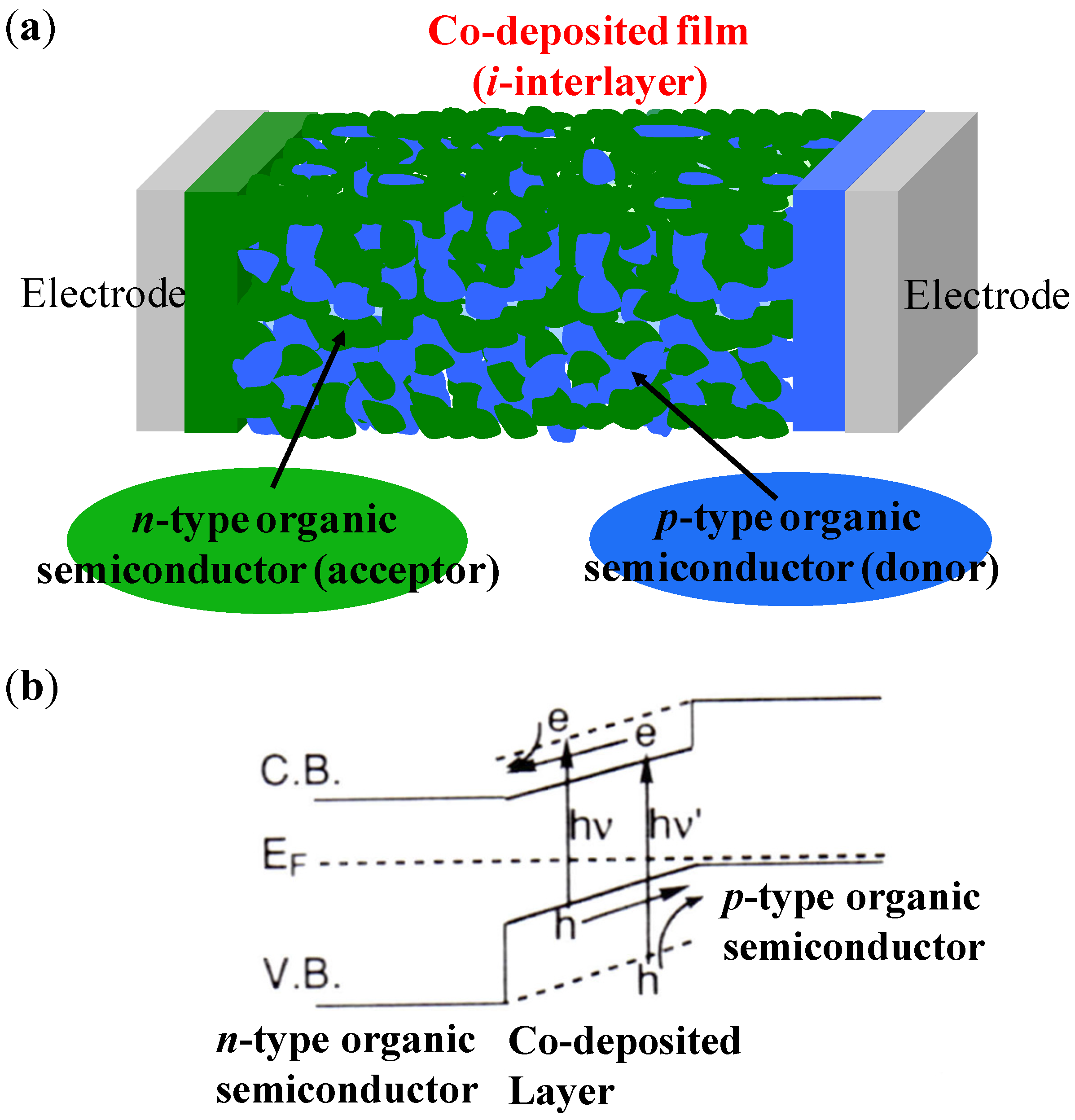 (a) pn-control of H2Pc:C60 co-deposited films by doping. The EF shift occurs within the “bandgap of the co-deposited film”. (b) Mechanism of n- and p-type formation.