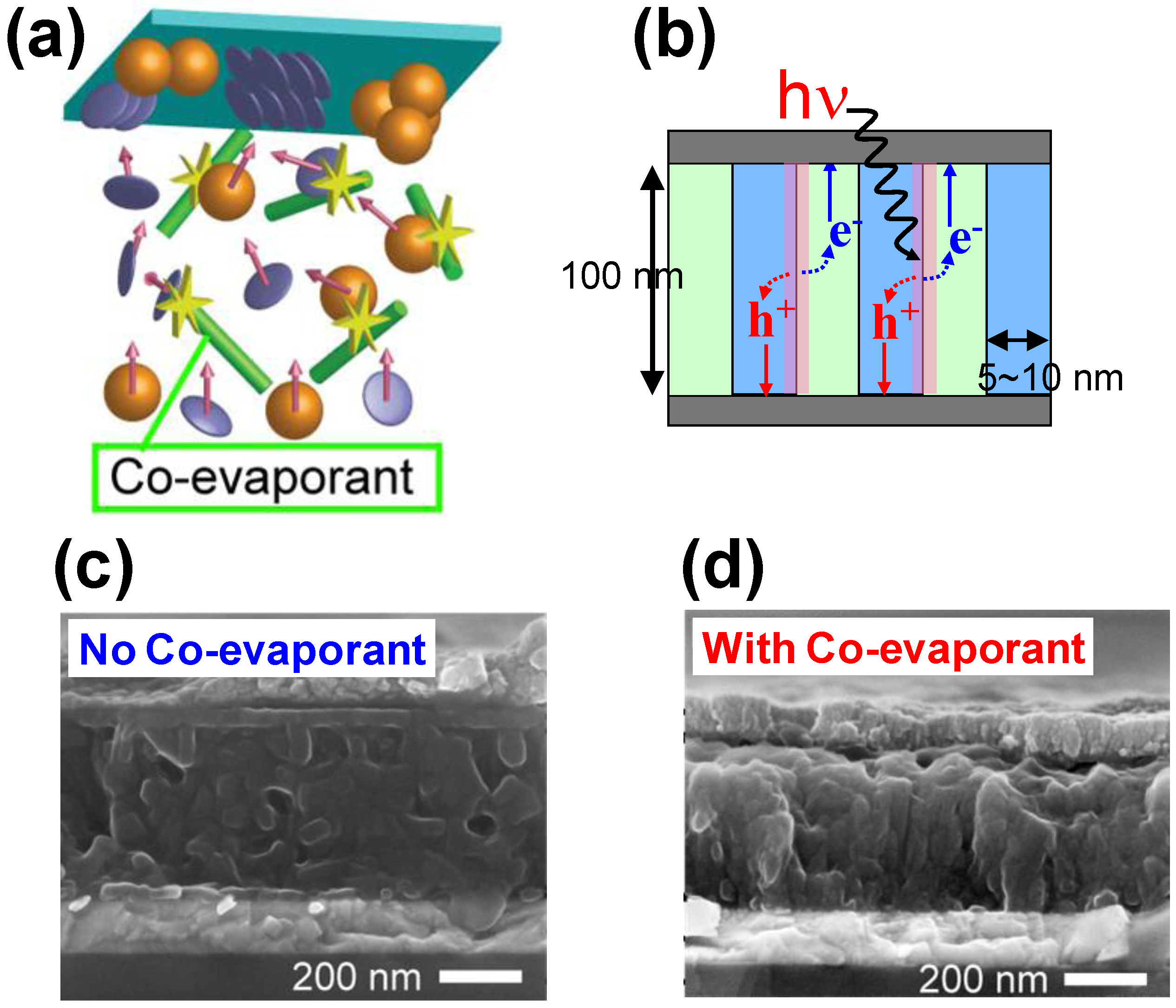(a) Co-evaporant 3rd molecule introduction. The balls, plates, and sticks correspond to C60, H2Pc, and 3rd molecules, respectively; (b) Vertical superlattice structure. Cross sectional SEM images of C60:H2Pc co-deposited films without (c) and with (d) 3rd molecule. Phase-separation and crystallization occurs by introducing co-evaporant 3rd molecule.