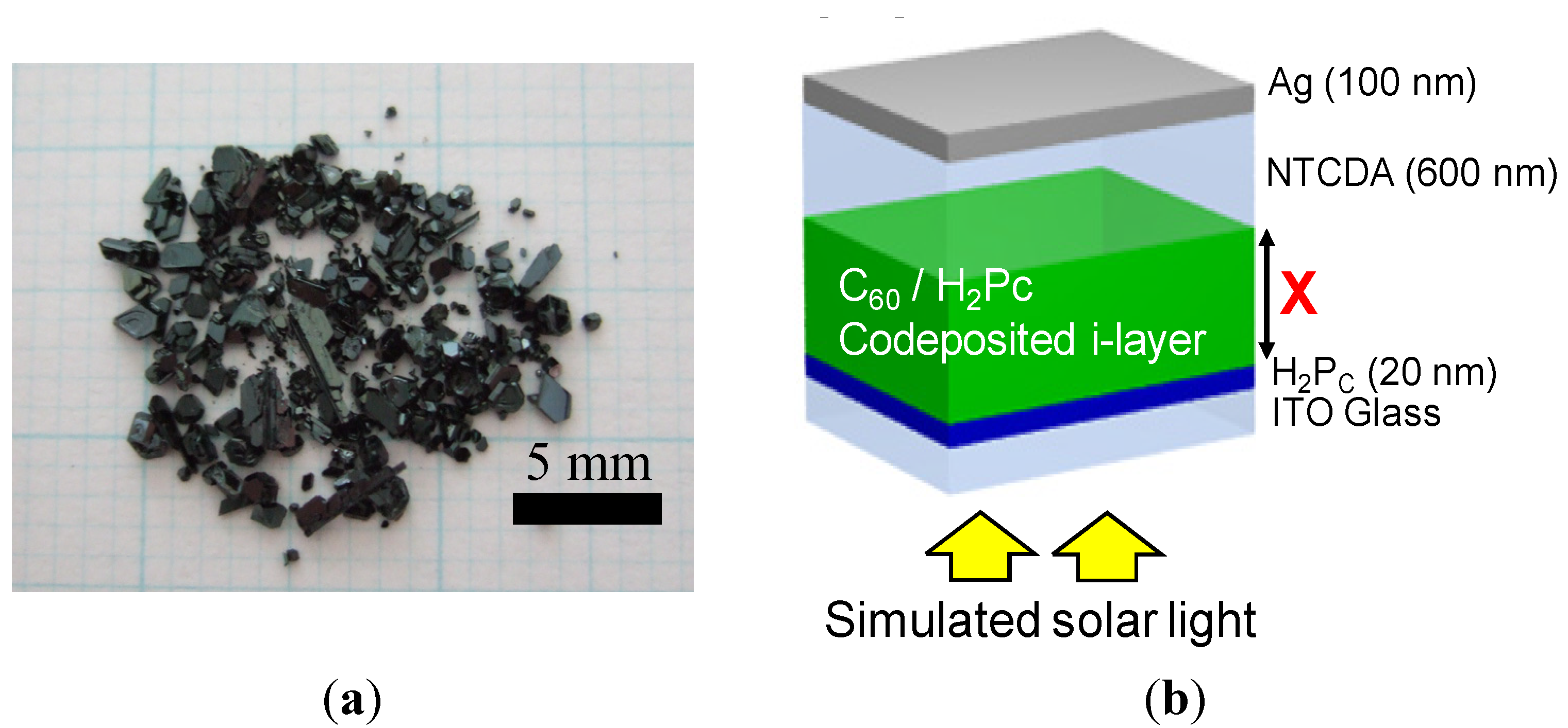 (a) Photograph of 7N-C60 single crystals; (b) Structure of organic p-i-n solar cell. The C60:H2Pc co-deposited layer (thickness: X nm) having a quasi-vertical superlattice structure (Figure 5b,d) is sandwiched between p-type H2Pc and n-type NTCDA.