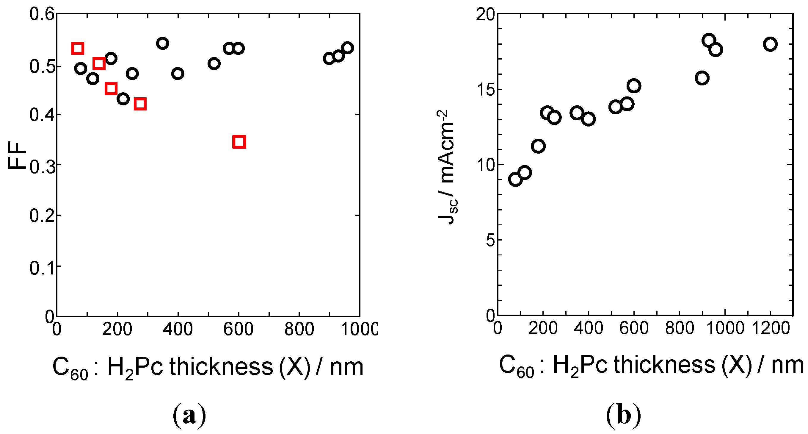 (a) Dependence of fill factor (FF) on the C60:H2Pc i-interlayer thickness (X) for p-i-n cells incorporating C60 purified three times by single-crystal formed sublimation (black open dots) and for p-i-n cells incorporating C60 purified by conventional train sublimation under vacuum (red open squares); (b) Dependence of short-circuit photocurrent density (Jsc) on X.
