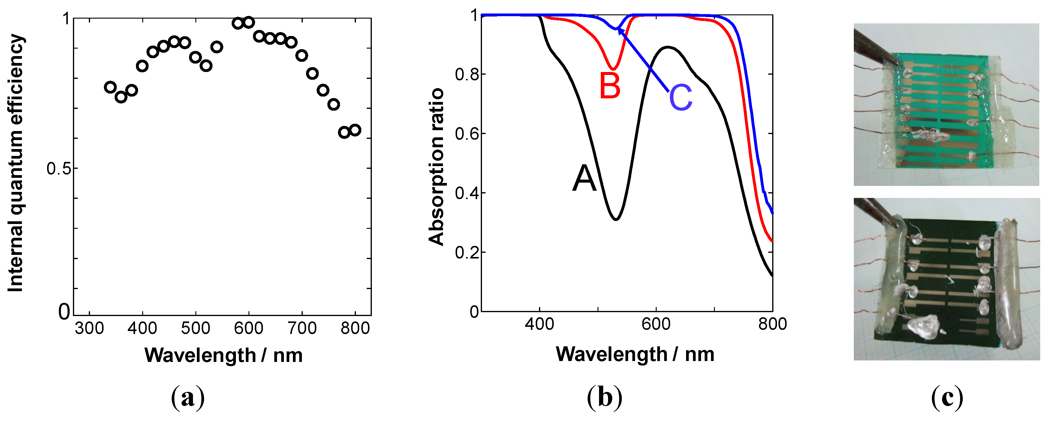 (a) Spectral dependence of the internal quantum efficiency for a cell with X = 960 nm; (b) Spectral dependences of the light absorption ratio of cells with X = 180 nm (curve A), 600 nm (curve B), and 960 nm (curve C); (c) Photograph of cells with X = 180 nm (top) and 960 nm (bottom).