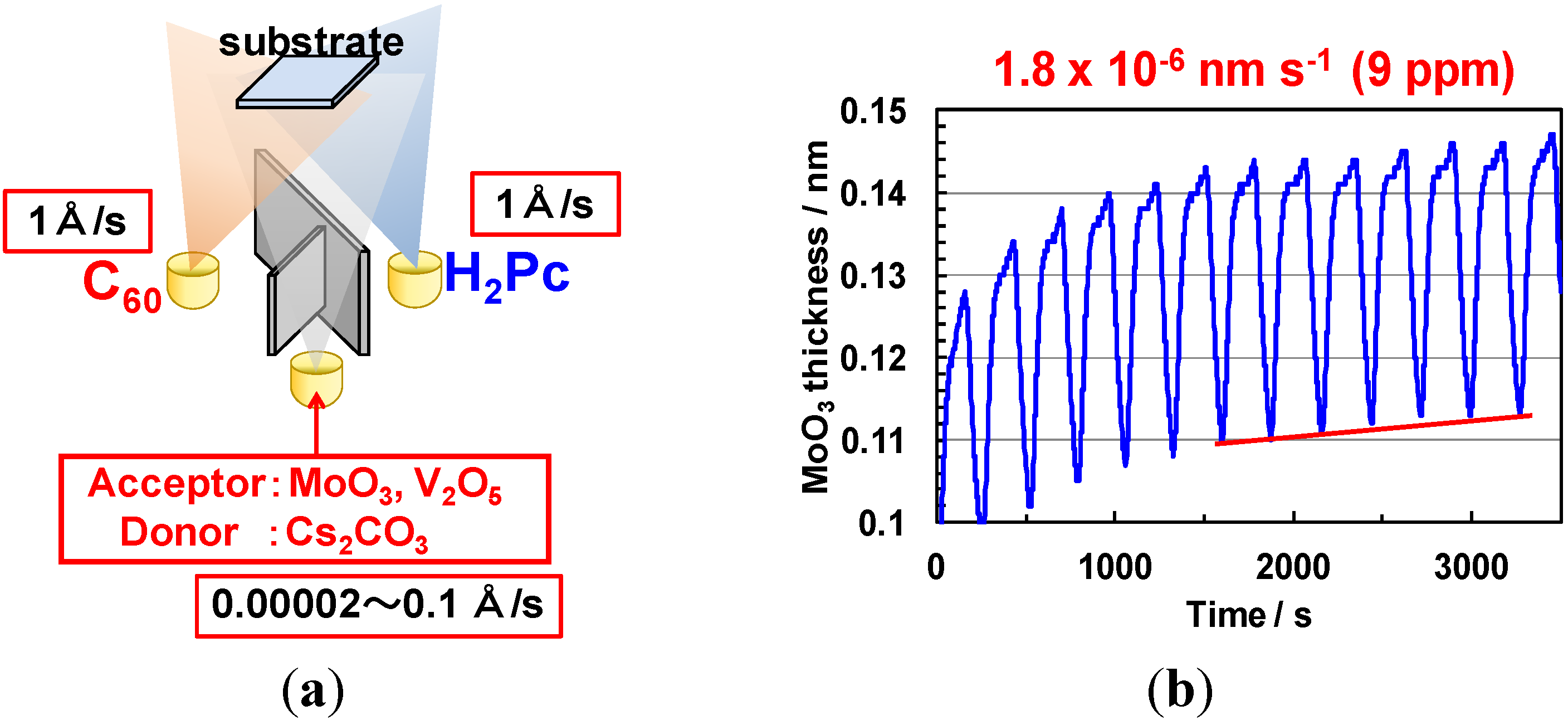 (a) Three-sources co-deposition. MoO3 and V2O5 acting as acceptors and Cs2CO3 acting as a donor were doped into the H2Pc:C60 (1:1) co-deposited film; (b) An example of the total-thickness signal from the QCM vs. time relationship for 9 ppm doping.