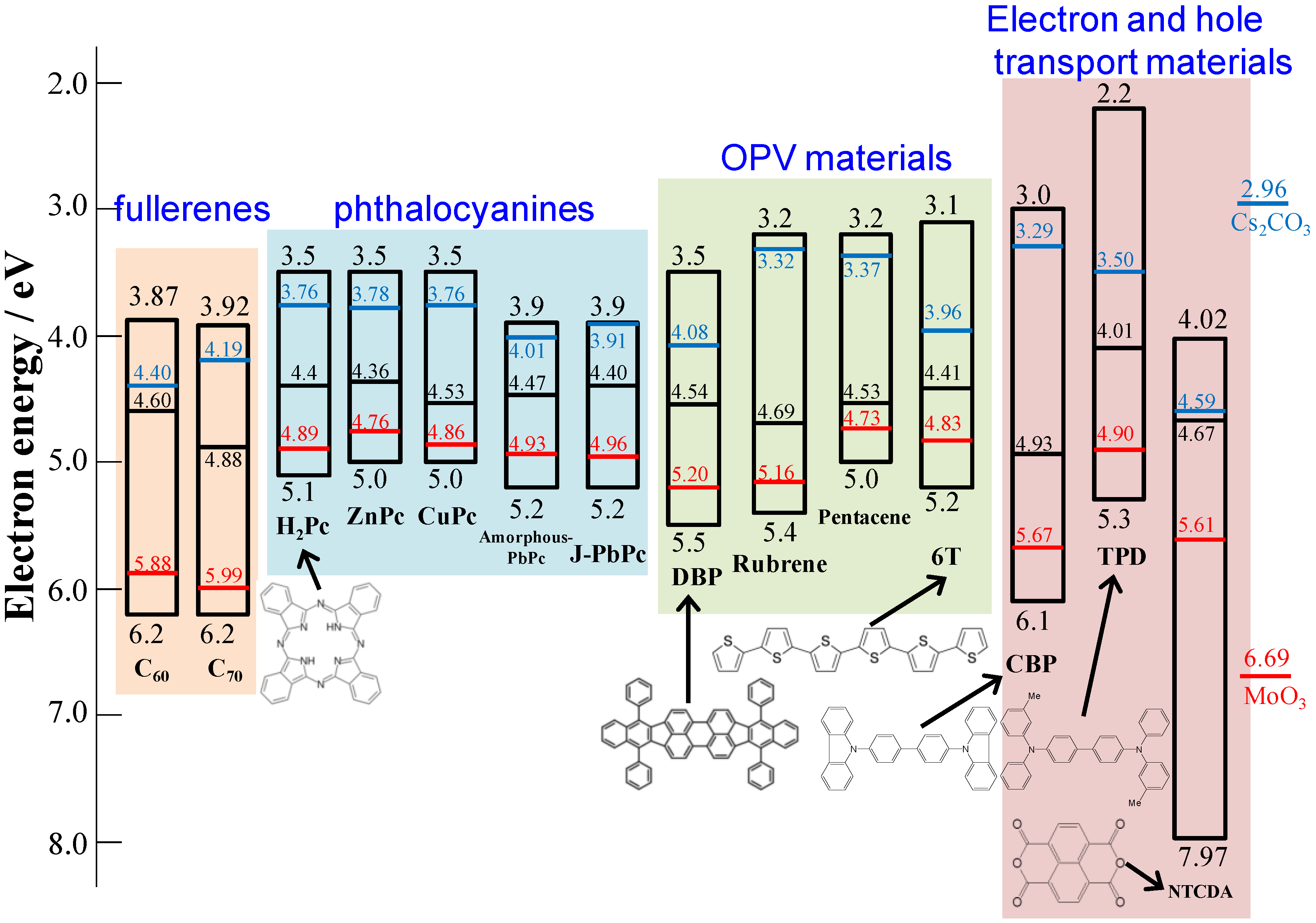 Energy diagrams of various organic semiconductor films. The black, red, and blue lines show the energetic position of EF for non-doped, MoO3-doped, and Cs2CO3-doped films. The doping concentration is 3000 ppm. EF vales for MoO3 and Cs2CO3 films (100 nm) are also shown.