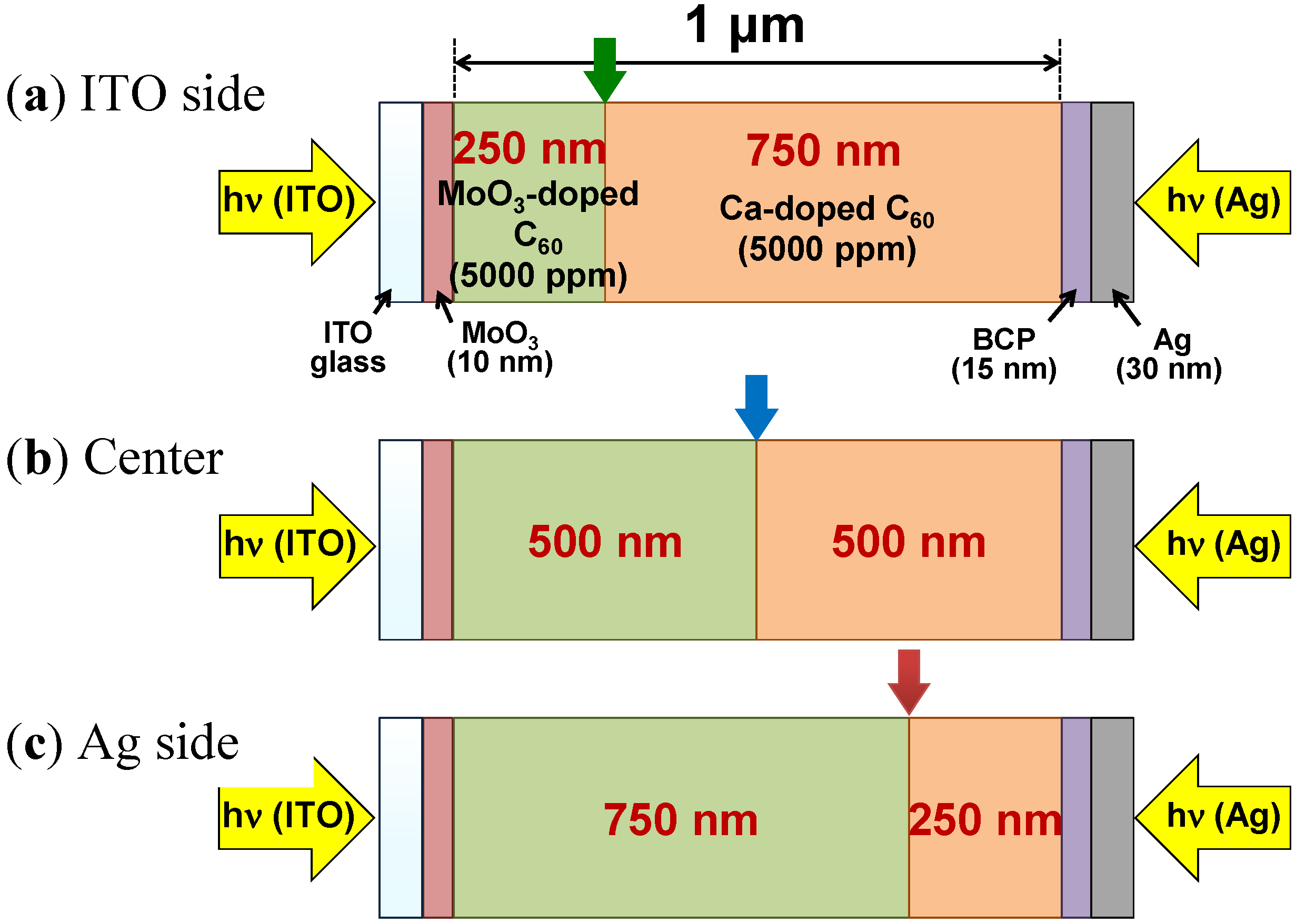 Three structures of pn-homojunction C60 cells. The thickness combinations of the MoO3- and Ca-doped layers are 250/750 nm (a); 500/500 nm (b); and 750/250 nm (c). The concentration was kept at 5000 ppm for both dopants. Hν (ITO) and hν (Ag) denote light irradiation onto the ITO and onto Ag electrodes, respectively. The locations of the homojunctions are indicated by the arrows.