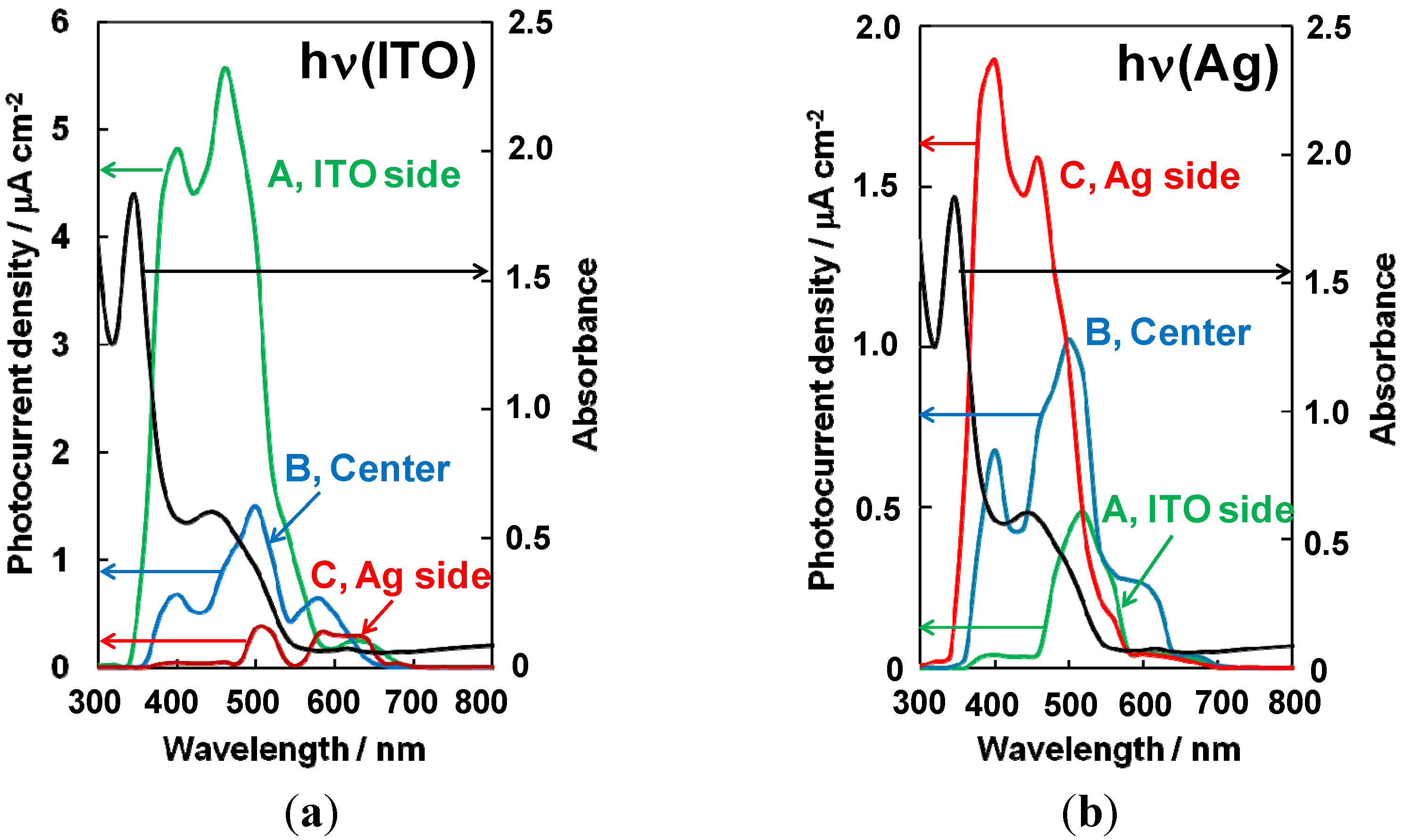 Since both p- and n-type C60 were formed, we tried to fabricate pn-homojunctions in the single C60 films [44,45]. Three types of cells with different thickness combinations of p- and n-doped layers, i.e., 250/750 nm (a); 500/500 nm (b); and 750/250 nm (c) were fabricated (Figure 14). The total thickness of the C60 was maintained at 1 µm for all cells. Figure 15 shows the action spectra for the three types of cells. Under irradiation onto the ITO electrode (Figure 14a, hν(ITO)) and with the homojunction located at the ITO side (Figure 14a and Figure 15a, curve A), photocurrent mainly appeared between 400 and 500 nm, which corresponds to the visible absorption region of the C60 film (black curve). For the homojunction at the center of the cell (Figure 14b and Figure 15a, curve B), the photocurrent decreased and shifted to longer wavelength and the main peak was located at the edge of the C60 absorption. Finally, for the homojunction on the Ag side (Figure 14c and Figure 15a, curve C), the low magnitude photcurrent shifted to a wavelength far longer than 500 nm, where there is little C60 absorption. The observed systematic change in the shape of the action spectra with respect to the distance of the homojunction from the light-irradiated electrode can be attributed to the so-called “masking effect”. This means that photocarrier generation occurs mainly in the neighboring regions of the p/n-doped interface (active zone) and that, by retracting this homojunction from the light-irradiated ITO surface, a dead layer is gradually grown in front of this active zone.
