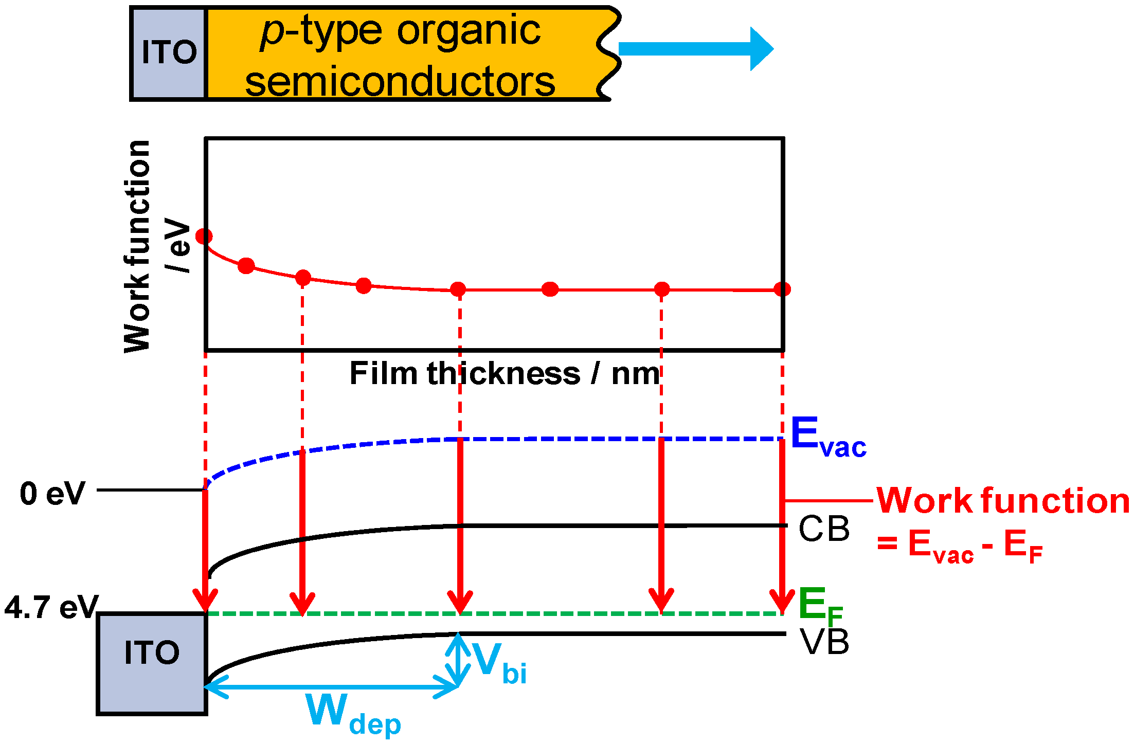 Principle of band-mapping by Kelvin probe. An interface between an ITO and a p-type semiconductor film is shown. Work function values (middle figure) corresponding to the double red arrows (lower figure) depending on the thickness of the organic semiconductor film were measured by Kelvin probe. Evac, EF, CB, and VB denote the vacuum level, the Fermi level, the conduction band, and the valence band, respectively.