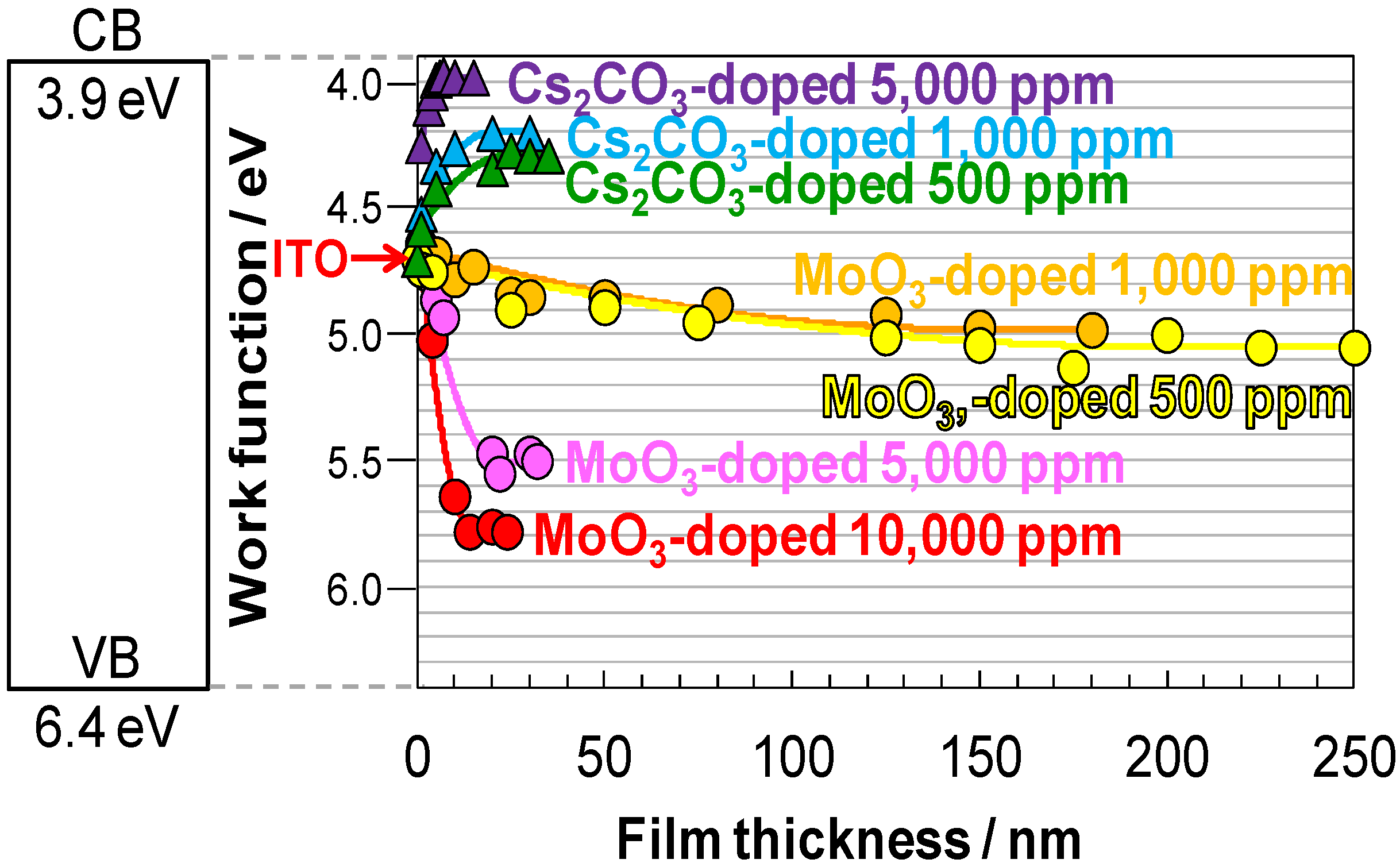 Work function shifts in C60 films doped with Cs2CO3 and MoO3 on ITO substrates (triangular and circular dots). Band-bending was fitted by a quadratic relationship based on the Poisson equation (solid curves).