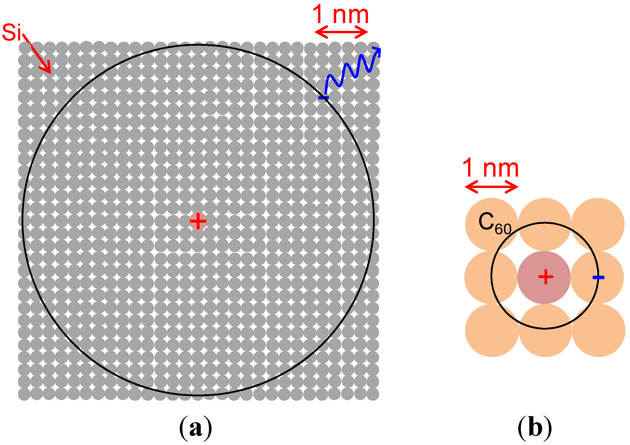 Orbital of an electron around a positive charge on an ionized donor. (a) P-doping in Si. P+ is represented by the red shaded circle. This situation resembles the Wannier exciton (Figure 1a); (b) Cs2CO3-doping in C60. Cs2CO3+ is represented by the red shaded circle. This situation resembles the CT-exciton (Figure 2b).