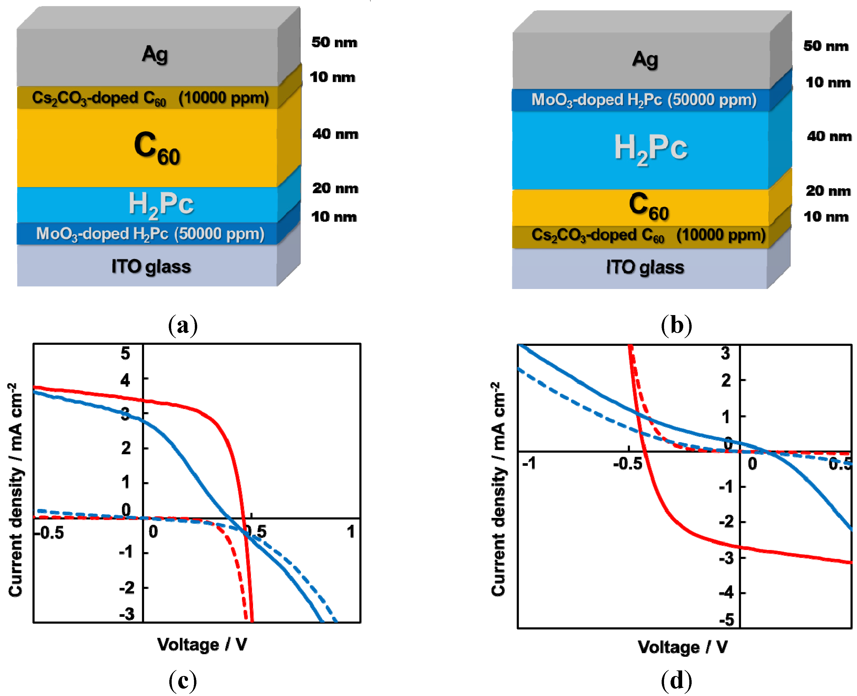 Structures of invertible two-layered H2Pc/C60 cells with heavily-doped organic/metal interfaces. For the cells in (a,b), photogenerated holes and electrons are extracted to ITO and Ag, and to Ag and ITO, respectively. The total thicknesses of the H2Pc and C60 films are kept the same; (c,d) Current-voltage (J-V) characteristics for the cell (a,b) (red curves). The blue curves are for cells without heavily doped interfaces. The photocurrent and the dark current are shown by the solid and broken curves, respectively. The ITO electrode was irradiated with simulated solar light (AM1.5, 100 mWcm−2). Cell performances: (a) Jsc: 3.38 mAcm−2, Voc: 0.46 V, FF: 0.59, Efficiency: 0.91%; (b) Jsc: 2.70 mAcm−2, Voc: 0.43 V, FF: 0.49, Efficiency: 0.57%. Copyright© 2012 The Japan Society of Applied Physics.