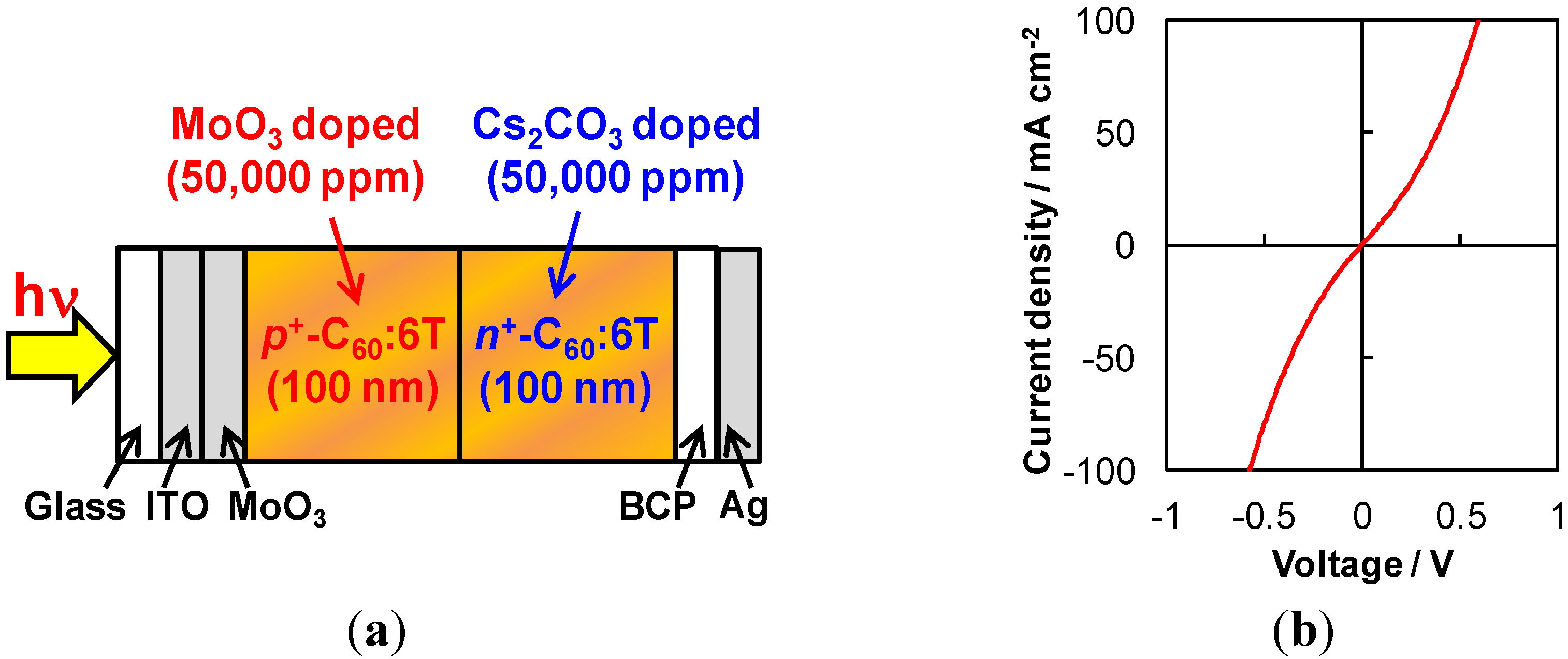 Irrespective of whether we use single or co-deposited films, by making an n+p+ heavily doped double layer, organic/organic ohmic junctions can be fabricated [45,60]. Figure 24a shows an n+p+-homojunction device fabricated in a C60:6T co-deposited film. MoO3 and Cs2CO3 were heavily doped (50,000 ppm (5%)) for the p+ and n+-regions, respectively. Obviously, the n+p+-homojunction showed good ohmic properties (Figure 24b).