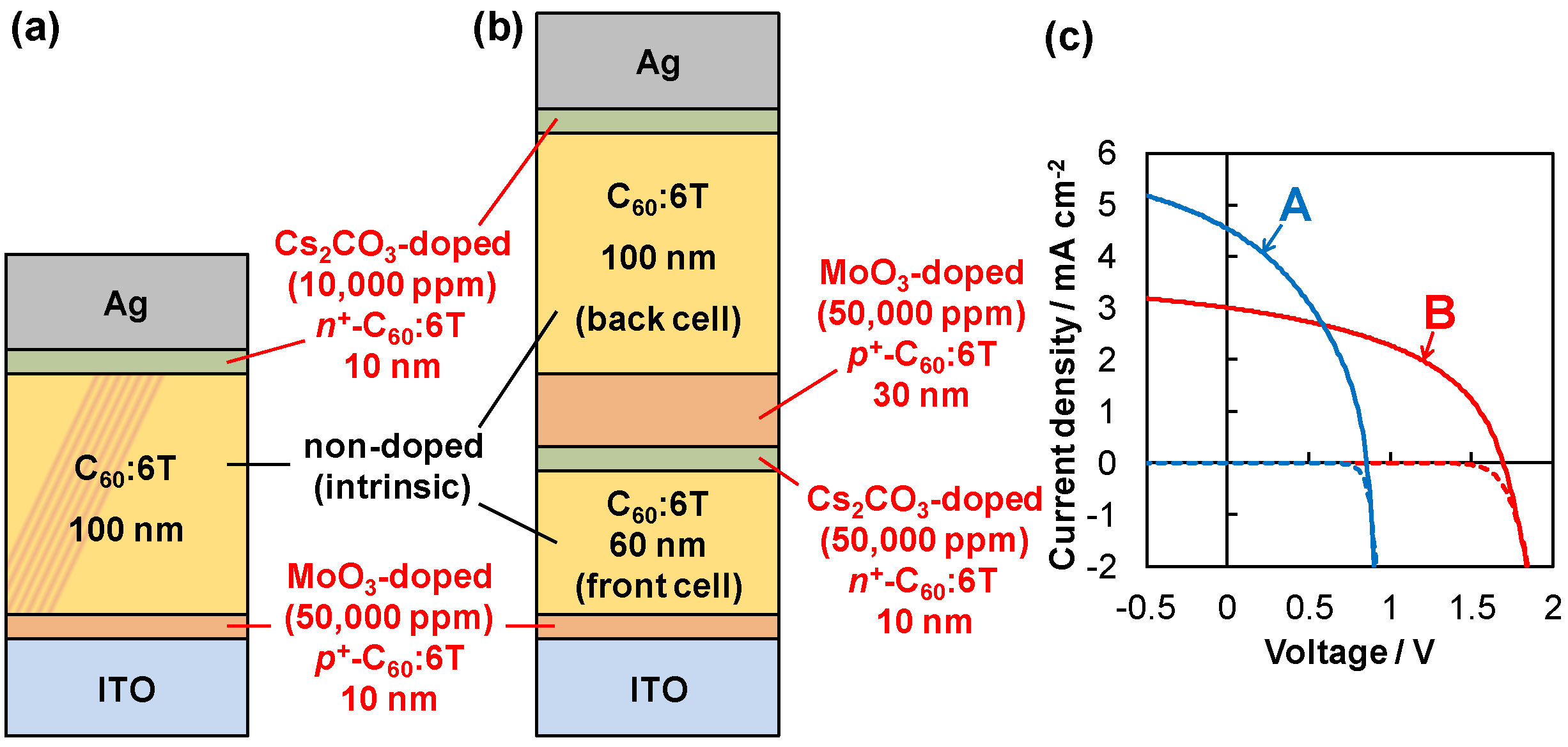 (a) Structure of a p+in+-homojunction cell fabricated in a C60:6T co-deposited film. A non-doped intrinsic C60:6T layer is sandwiched between heavily doped p+ and n+-C60:6T layers; (b) Structure of a tandem cell connecting two unit p+in+-homojunction cells via an ohmic n+p+-homojunction; (c) Current voltage (J-V) characteristics for a single p+in+-homojunction cell (blue curves A) and a tandem cell (red curves B). The photo and dark currents are shown by the solid and the broken curves, respectively. The ITO electrode was irradiated with simulated solar light (AM 1.5, 100 mW cm−2). The cell parameters, i.e., Jsc, Voc, FF, and efficiency. Curve A: 4.5 mA cm−2, 0.85 V, 0.41, 1.6%. Curve B: 3.0 mA cm−2, 1.69 V, 0.47, 2.4%.