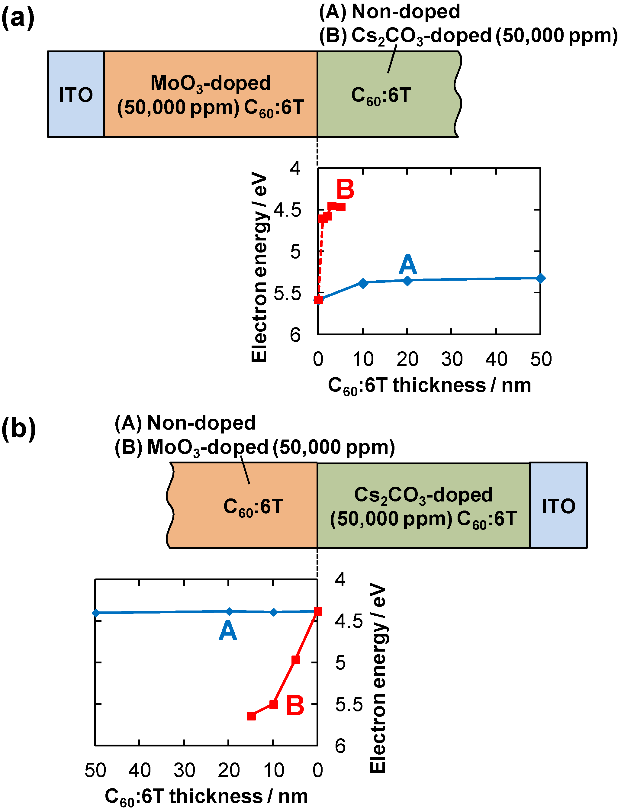 Energy level mapping of homojunctions using a Kelvin probe. The sample structures and the dependence of the position of the Fermi level (EF) on the thicknesses of the non-doped or doped C60:6T films are shown. (a) Non-doped (blue curve A) or Cs2CO3-doped (red curve B) deposited on a MoO3-doped C60:6T film; (b) Non-doped (blue curve A) or MoO3-doped (red curve B) C60:6T film deposited on a Cs2CO3-doped C60:6T film.