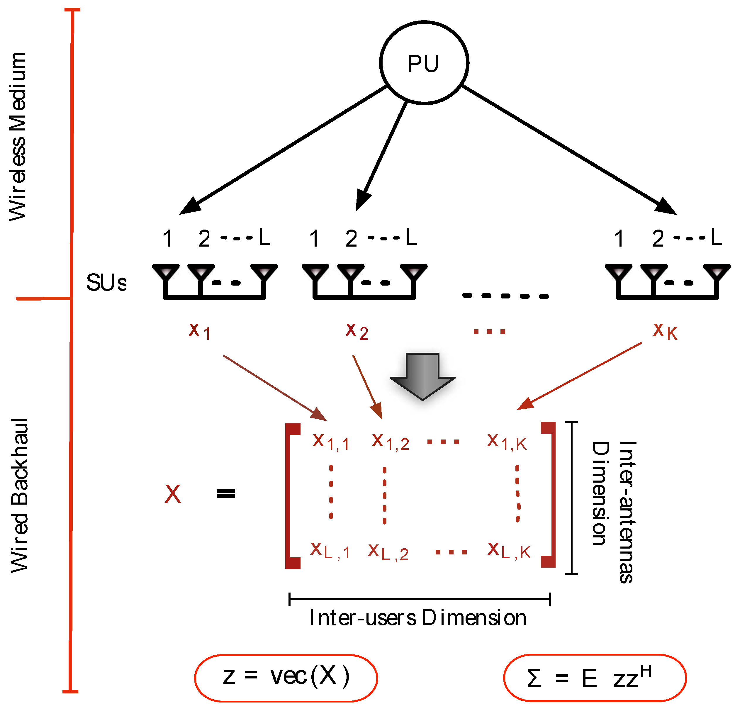 where the covariance matrices , capture the inter-antennas correlation present in the signal received at L antennas of the k-th SU. Similarly, non-zero off-diagonal blocks with indicate the presence of inter-receiver spatial correlation. Furthermore, in most practical working conditions, it seems reasonable to consider the ensemble vectors to be zero mean complex Gaussian distributed, a case that is particularly well-suited for orthogonal frequency division multiplexing (OFDM) [21]. It is to be noted that we begin with the complex baseband signal sampled at the specific Nyquist rate. Hence, the hypotheses become: