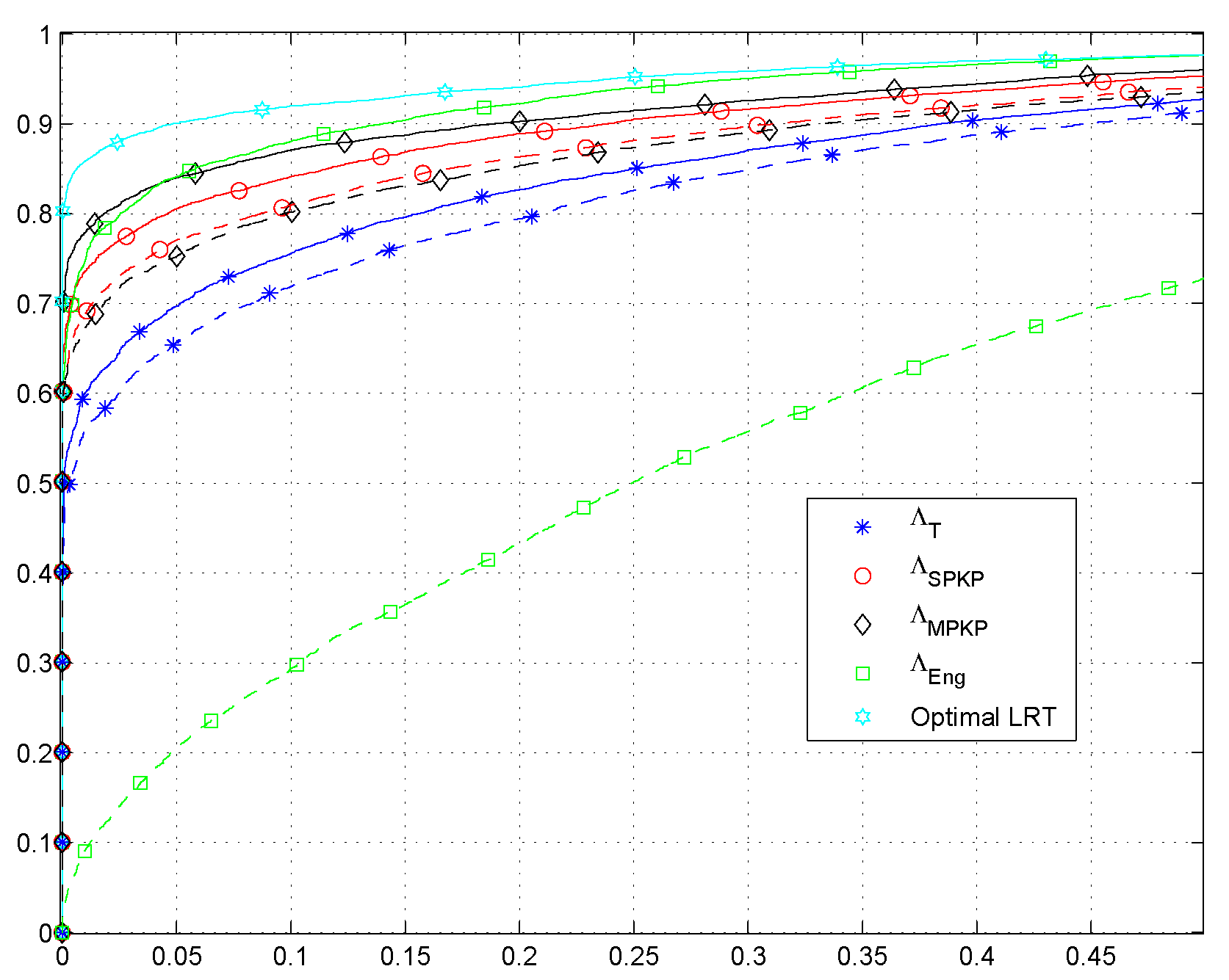 Receiver operating characteristic (ROC) curves: L = 4, K = 10, N = 70, κ = −15 dB. Solid Lines and Dashed Lines αnu = 2.