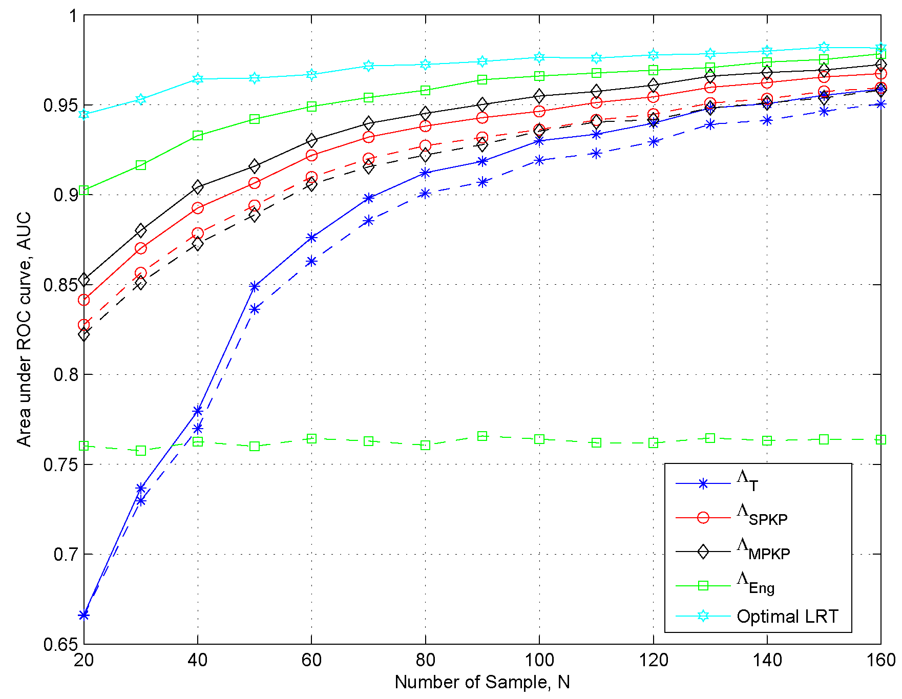 Area under the ROC curve to asses the effects of the sample size N, using, κ = −15 dB. Solid Lines αnu = 1, Dashed lines αnu = 2.