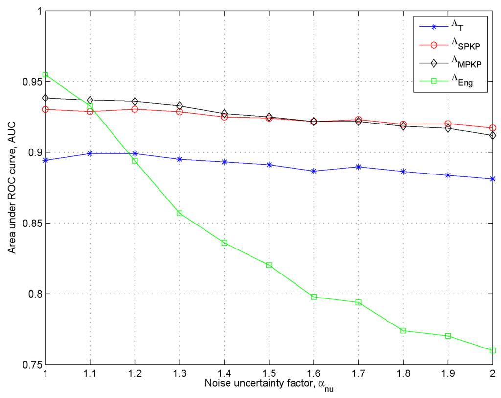 In order to analyze the performance of the proposed detectors, we use receiver operating characteristic curve (ROC) and area under the ROC curve (AUC), which varies between 0.5 (poor performance) and 1 (good performance). Moreover, we define the average signal-to-noise ratio (SNR) of all SUs as: and the SNR of i-th SU is where is the minimum SNR among those of the SUs []. For a given average SNR and SNR gap ζ, we can generate the random SNRs of the SUs. Similarly, in order to analyze the effect of noise power uncertainty we generate the noise power at k-th SU as , where , and means no noise uncertainty.