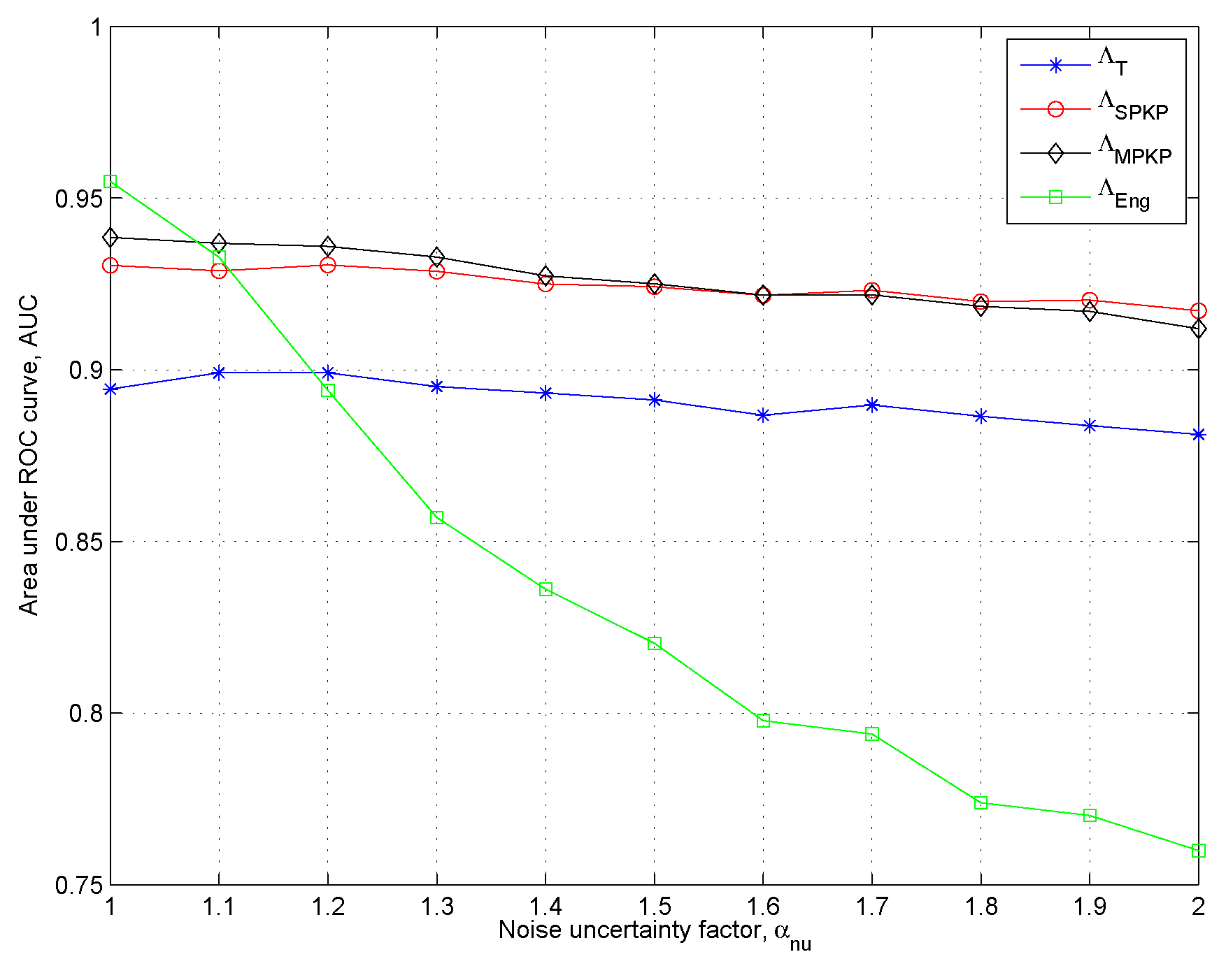 In order to analyze the performance of the proposed detectors, we use receiver operating characteristic curve (ROC) and area under the ROC curve (AUC), which varies between 0.5 (poor performance) and 1 (good performance). Moreover, we define the average signal-to-noise ratio (SNR) of all SUs as: and the SNR of i-th SU is where is the minimum SNR among those of the SUs [13]. For a given average SNR and SNR gap ζ, we can generate the random SNRs of the SUs. Similarly, in order to analyze the effect of noise power uncertainty we generate the noise power at k-th SU as , where , and means no noise uncertainty.
