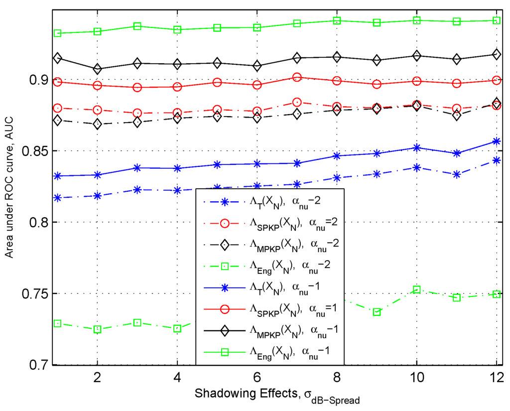 Area under the ROC curve to asses the effect of Shadowing, σdB–Spread: N = 60, κ = −15 dB and Solid Lines αnu = 1, Dashed lines αnu = 2.