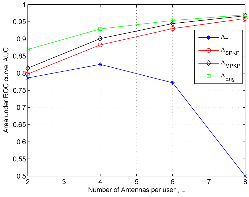 Area under the ROC curve to asses the effect of number of antennas: N = 60, κ = −15 dB and αnu = 1.