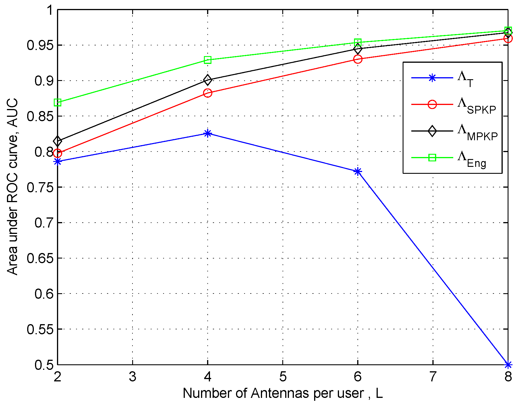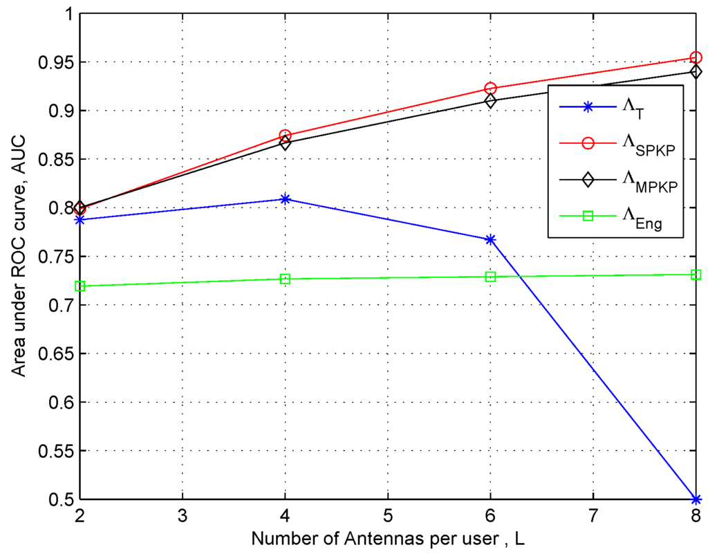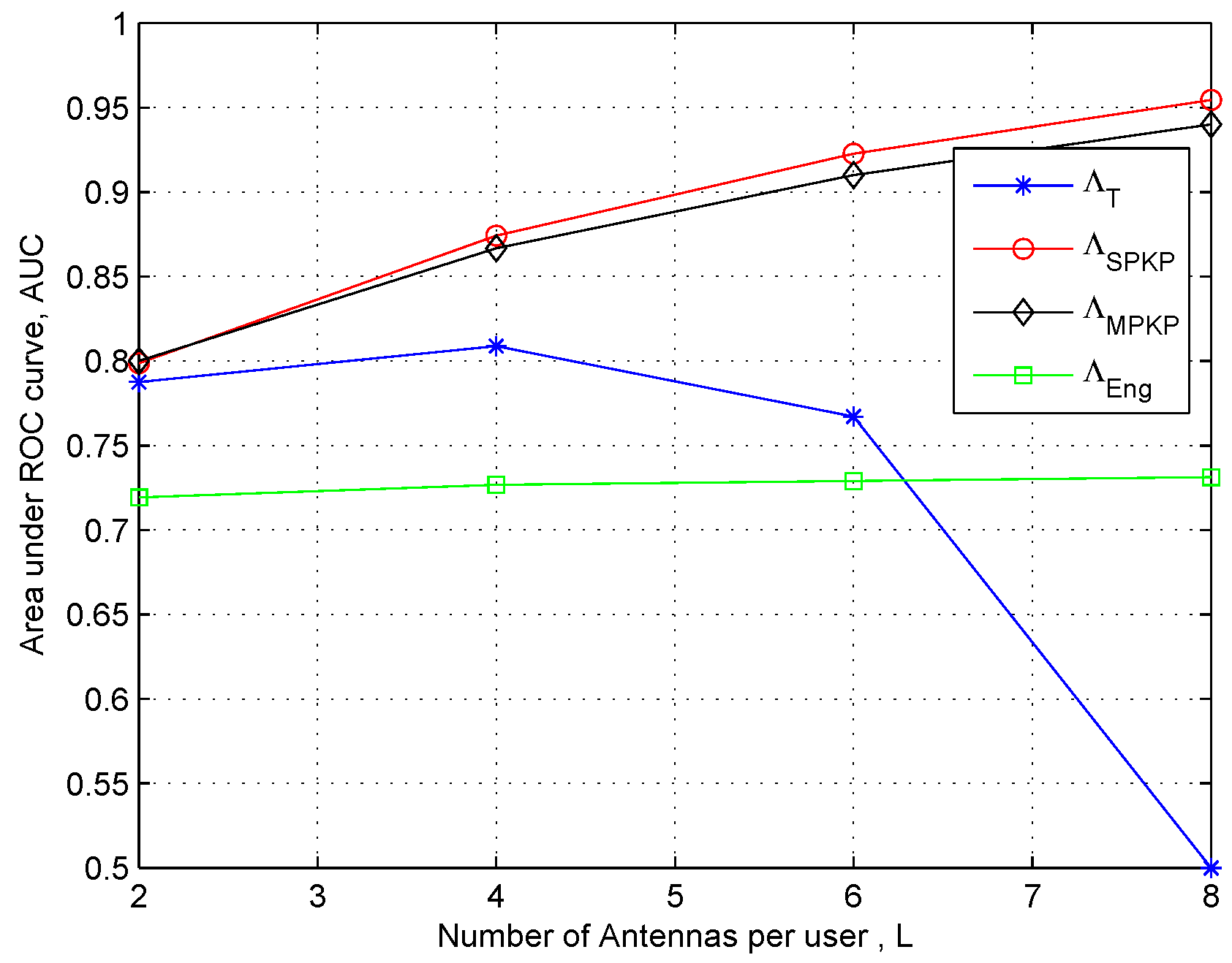 In Figure 6 and Figure 7, we show the AUC plots to analyze the effect of number of antennas (i.e., L) for a fixed number of users K. The results clearly show that the performances of the two proposed schemes are consistently better than the traditional schemes that confirm result in previous plots. However, we can see that the traditional GLRT performance degrades by increasing L (i.e., to ). It is because for fixed when , we have and we get ill-conditioned sample covariance matrix needed for implementation of GLRT. One the other hand, once again the results in these figures prove that and are robust against the issue of large dimensional data and small sample support.