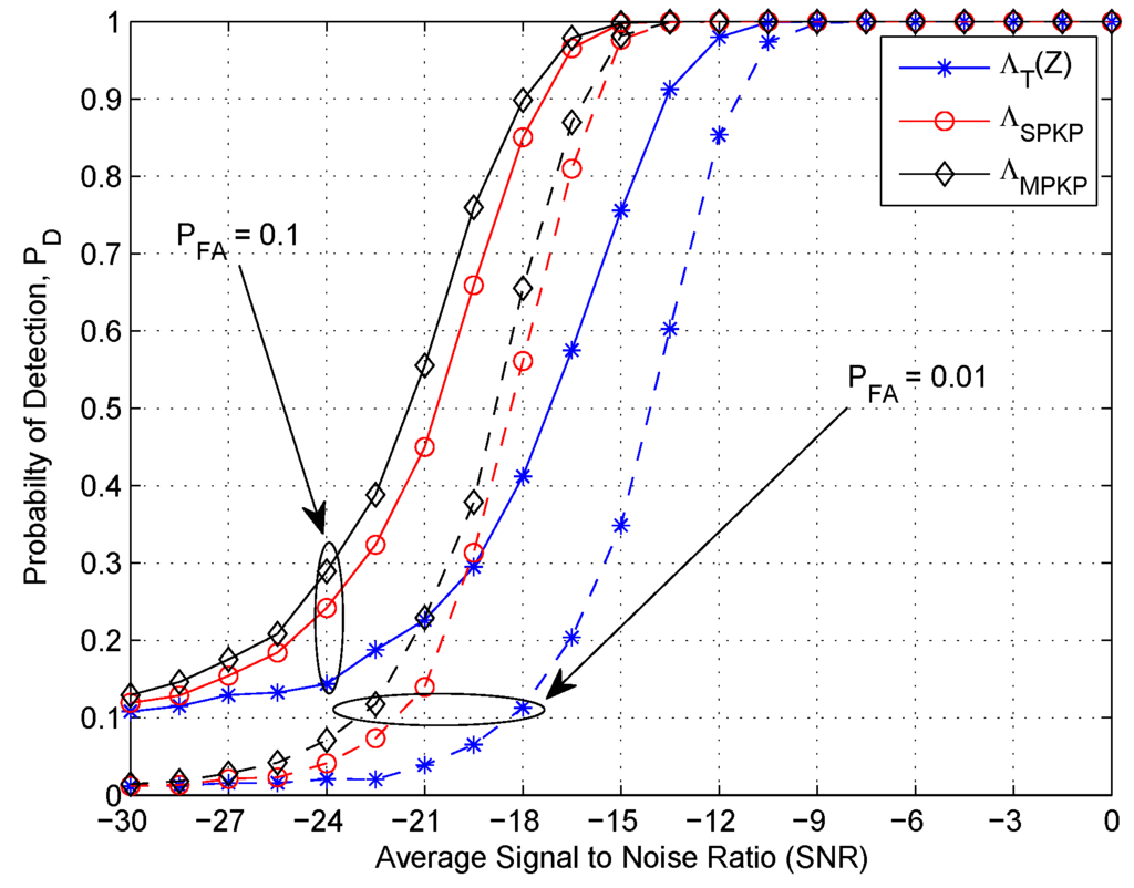 In Figure 2 we plot ROC curves to compare the performance of our proposed spectrum sensing schemes with the optimal likelihood ratio test (LRT) and the energy detection schemes. For the the optimal LRT, to solve Equation (6) we assume that the covariance matrices under both hypothesis are known. On the other hand the energy detector is given as: