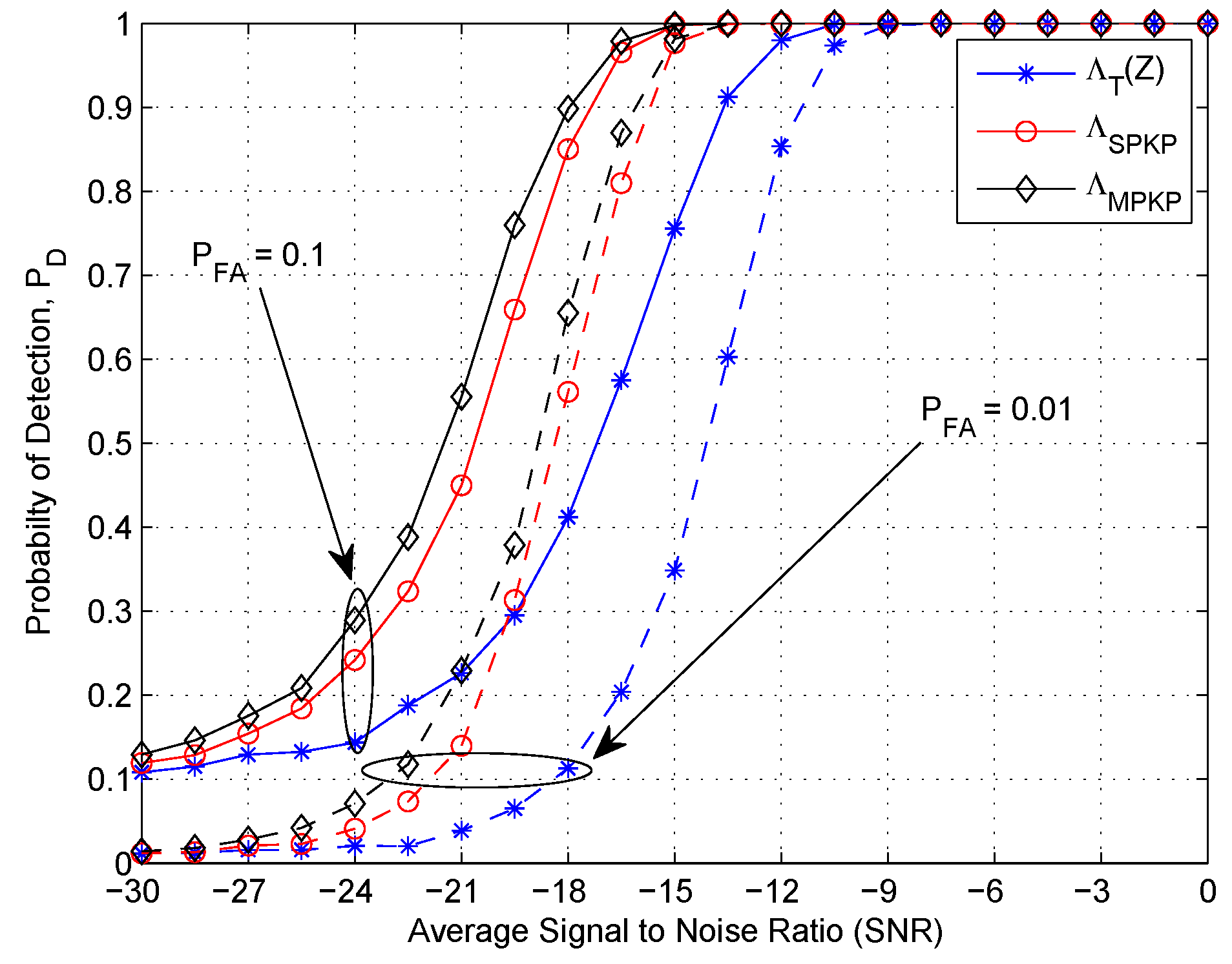 Compared to the SPKP-GLRT in Equation (13), the MPKP-GLRT in Equation (18) can better account for the different inter-antenna structures, since it is not constrained to the assumption of identical inter-antenna correlation at different SUs. However, the computational cost of the detection scheme Equation (18) is slightly higher than that of Equation (13). This is because the number of free parameters in the covariance matrix to be estimated under hypothesis has increased to [19].