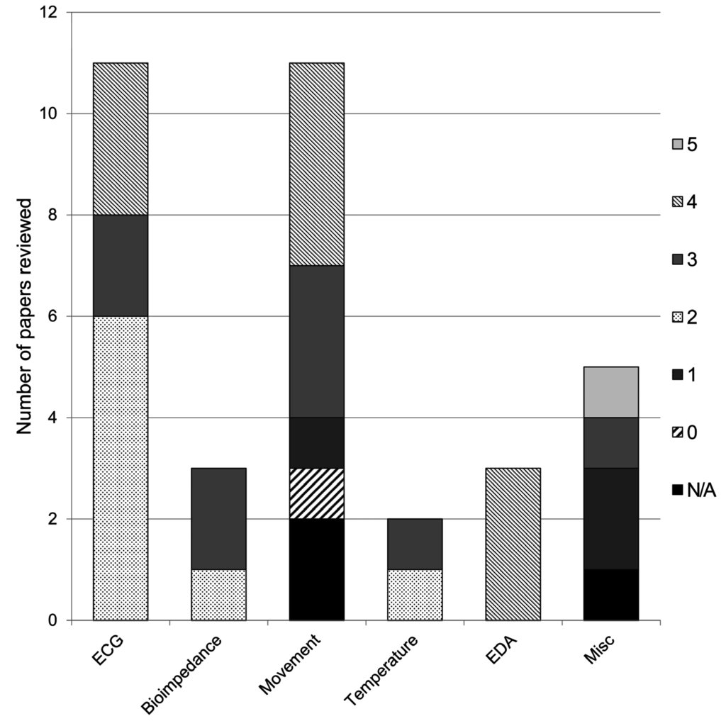 A variety of physiological and behavioral measurements, relevant to clinical rehabilitation, have been enabled through the integration of sensors within a fabric substrate. Some sensors, such as electrocardiogram (ECG) electrodes, are commonly used and the degree of integration is such that an acceptable quality signal is possible from what looks and feels like simple fabric. Other sensors are in their infancy, little more than proof-of-concept, and are therefore often as bulky and obtrusive as their standard non-textile counterparts. The results of our search are presented below by the phenomenon measured. Each of the ensuing sections follows a common format: introduction to the phenomenon of interest, current measurement practice, textile innovations, and, merits and limitations of the current textile technology. The review closes with some recommendations for future research. Figure 1 summarizes the number of studies appraised by phenomenon (horizontal axis) and degree of integration (shading).