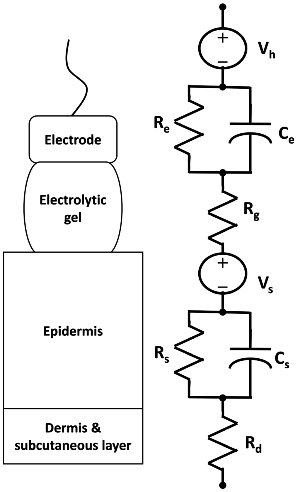 Electrodes are positioned on either side of the heart in pairs and conventionally require a conducting gel. Figure 2 depicts an electrical model of a wet electrode-skin interface [52]. In this model, Vh,Re and Ce are the half-cell potential of the electrode (dependent on type of material), its resistance and its capacitance. Rg is the effective resistance of the gel; Vs is the potential due to the semi-permeability of the stratum corneum, the top layer of the epidermis; Rs and Cs are the resistance and capacitance of the epidermal layer and Rd is the resistance of the deeper skin layers. While the number of electrodes may vary, 12-lead ECG monitoring is typically accepted as the “gold standard” in arrhythmia diagnosis [53]. Classic ECG monitoring requires that the patient remain stationary in the supine position and is thus not conducive to continuous ambulatory monitoring. Wearable Holter devices facilitate long-term and ambulatory monitoring of general wellness, sport, sleep, and numerous heart irregularities, often providing data for heart rate variability analyses [18,19,39].