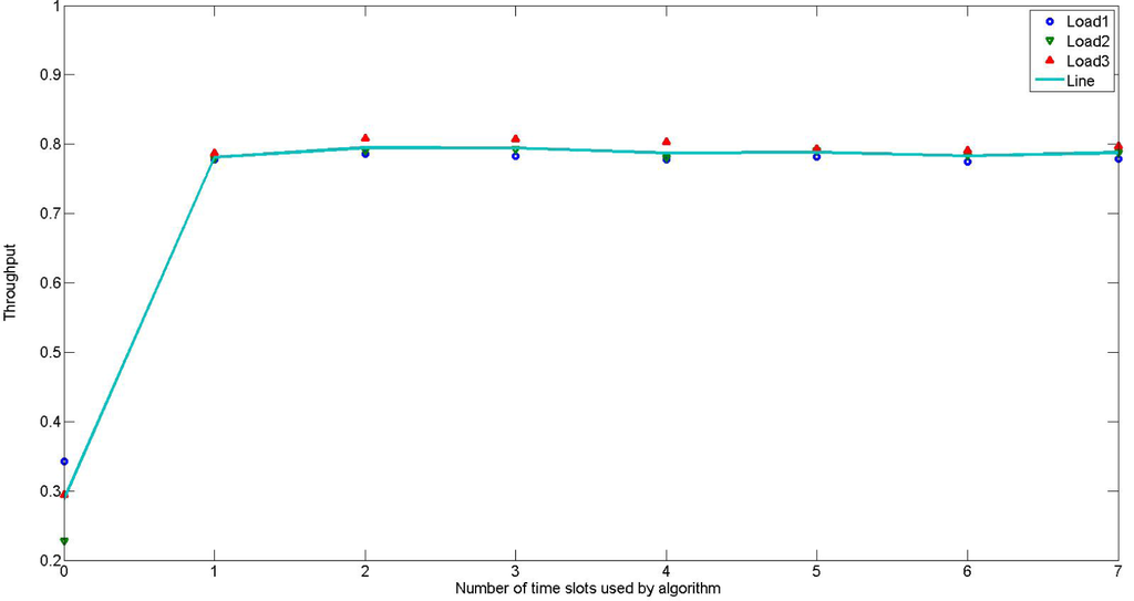 One can compare the throughput when using Method 3 for different values of N. For the simulation environment we have developed, we have determined that the optimal throughput is achieved when N = 3; however, in actuality, minimal throughput gain is found beyond N = 2. To visualize this, the results for three different network loads are shown in Figure 10, which shows throughput with N = 1 to be much higher than with N = 0 and N = 2 and N = 3, achieving some small increase over N = 1. Given the extra computational complexity for higher values of N, we suggest using N = 2. Other network environments may find a different optimal value.