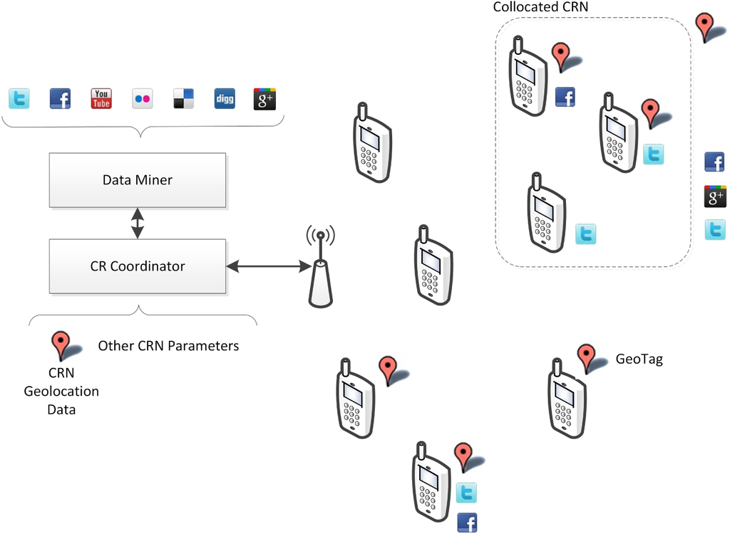 The emergence of low-cost mobile communication devices and digital storage technologies is enabling the rapid creation and dissemination of information on a global scale. Digital information, ranging from user-generated data (e.g., captured through social media, such as Twitter, Facebook, Google +, etc.), to data generated through industry and government efforts, is establishing a new dimension of social-driven knowledge discovery. These data, fed through the appropriate cognitive engines, might inform cognitive radio beyond what radio parameters alone can do and, in the process, expand bandwidth. The challenge facing us is not the lack of digital information, but rather the synthesis of large-scale, multi-domain data and their transformation into actionable information by cognitive radio systems. Figure 2 shows how data may come from cognitive radios and/or other sources. Some of the cognitive radios may be collocated in a geographical region (e.g., coffee shop, mall, concert venue, etc.) that also has data associated with it, as well as data generated by the cognitive radios in that region, all of which may be mined [19].