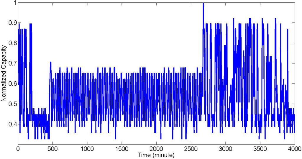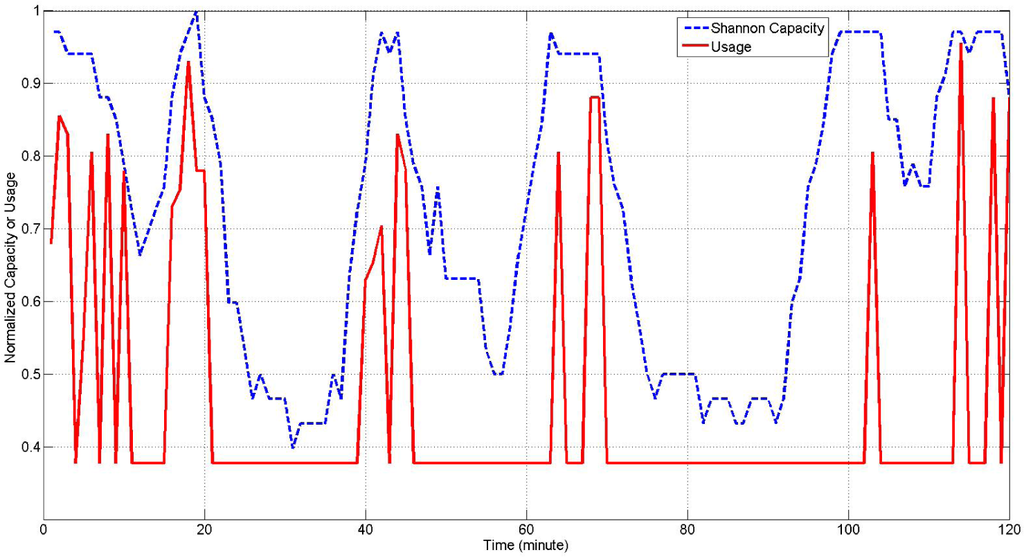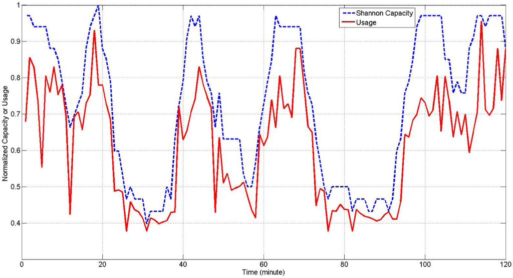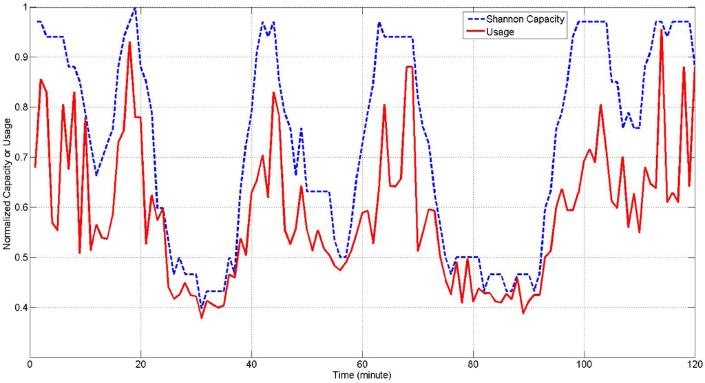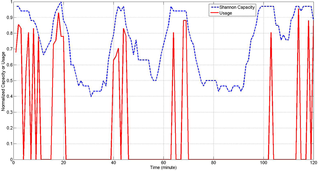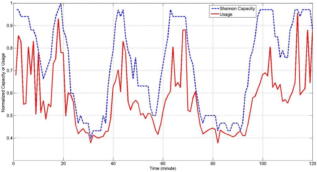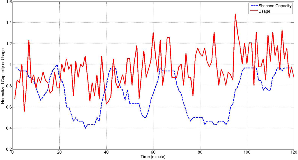 The actual wireless channel capacity depends on many factors, including the coding scheme used in the physical layer, but here, we use the Shannon capacity to correlate the RSS measurements and the channel’s available capacity. Based on RSS measurements, the channel Shannon capacity can be seen in Figure 3 for 4,000 min with one-minute resolution. For the demonstration of the algorithms proposed, we plot only the first 120 min, such that the channel variations can be observed. The channel usage and capacity are normalized by the maximum channel capacity, and their variations over time are plotted in Figure 4. As shown, the demand for usage can be higher than the channel capacity during some time periods, which results in collisions in the current medium-access algorithms. During other time slots, the wireless channel is underutilized. In order to achieve a closer-to-optimum throughput, the radio network should delay transmitting data packets in an over-utilized channel until the wireless channel is underutilized. This requires that the layers higher than the physical layer need to have understanding of the physical layer for wireless communication.