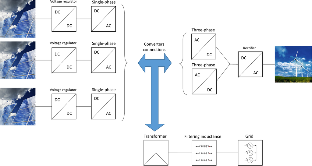 In the former solution, the power is produced by homologous separated sources located in the same region, and therefore, the sources will deliver approximately the same amount of power: considering, for example, photovoltaic cells or wind power plants, the solar irradiation or wind speed can be assumed to be nearly the same in the near areas. If this hypothesis is removed, the power plants must be able to regulate the power delivered, such as the pitch control, in order to obtain the same amount of power always in the single-phase converters. With a smart design of the solar arrays and using additional switches, the power surplus may be addressed to another DC bus (the three-phase DC bus, for example): this smart connection between all of the DC sources would be important in the hypothesis of failure, because it allows recovering the power that normally would be lost.