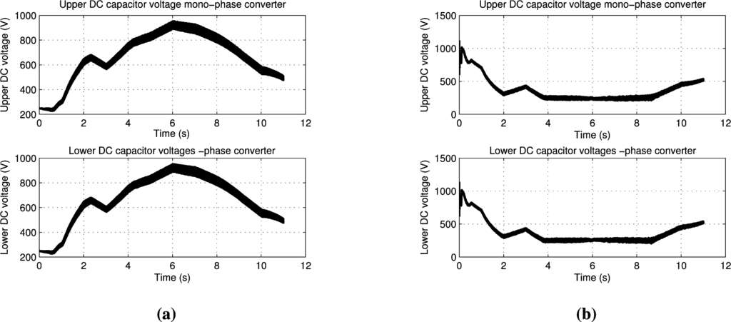 In Figure 11, the capacitor voltages of the single-phase and three-phase DC links have been depicted: the voltage is variable according to the power available from the source. In Figure 11b, the three-phase DC voltages have a flat top centered at V = 250 V; this limit has been implemented in order to avoid the voltage inversion on the electrolytic capacitors, which may destroy the components themselves.