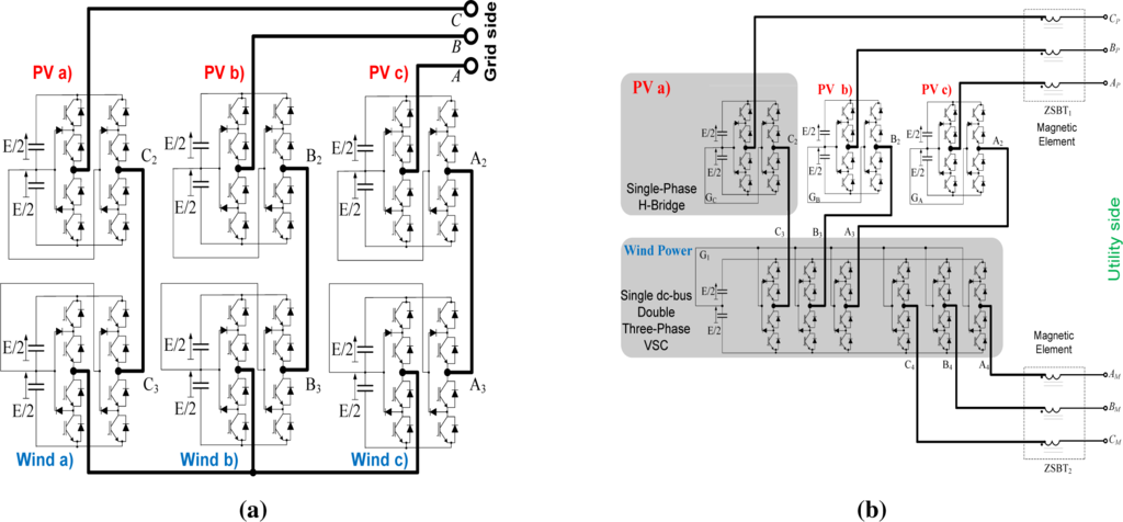 Single-phase H-bridge and studied topology comparison: P V means photovoltaic source; W ind means wind source. (a) Cascaded H-bridge VSCwith 3L-neutral point clamped (NPC) [8]; (b) the studied topology proposed in [8].