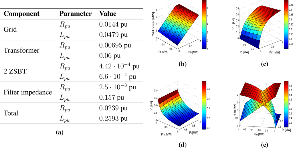 Circuit parameters used and optimization results represented as a function of the single-phase and three-phase available power. (a) Simulation positive sequence parameters per unit system; (b) power delivered to the grid in MW; (c) single-phase voltage phasor amplitude, kV; (d) three-phase voltage phasor amplitude, kV; (e) Id and Iq current surfaces, kA.
