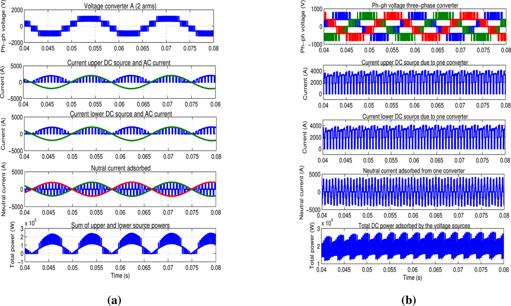 Single-phase and three-phase converters waveforms with constant voltage generators and with P m = 0.5 MW, P t = 1 MW. (a) Single-phase converter waveforms; (b) a single three-phase converter waveform.