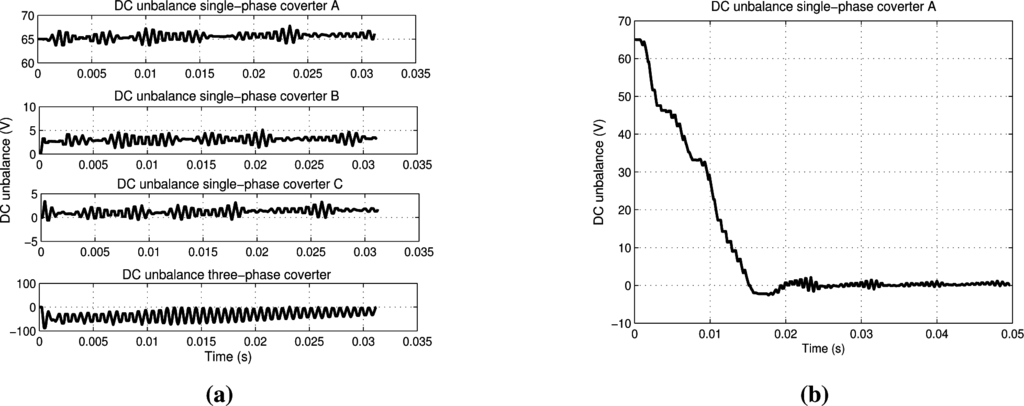 Single-phase balancing circuit operation. (a) DC voltage unbalance with pre-charge voltage in single-phase converter A set to +65 V; (b) result with an initial unbalance set to +65 V with balancing circuit.