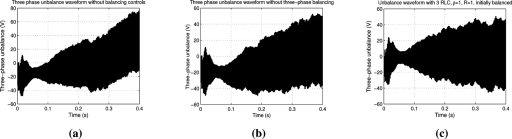 In Figure 9, the operation of the three-phase RLC balancing circuit is represented with initially balanced capacitors: without the RLC balancing circuit, the single-phase balancing circuits affect the three-phase unbalance (comparison between Figure 9a,b), but a better result is obtained with the contribution of the three-phase balancing circuit (Figure 9c).