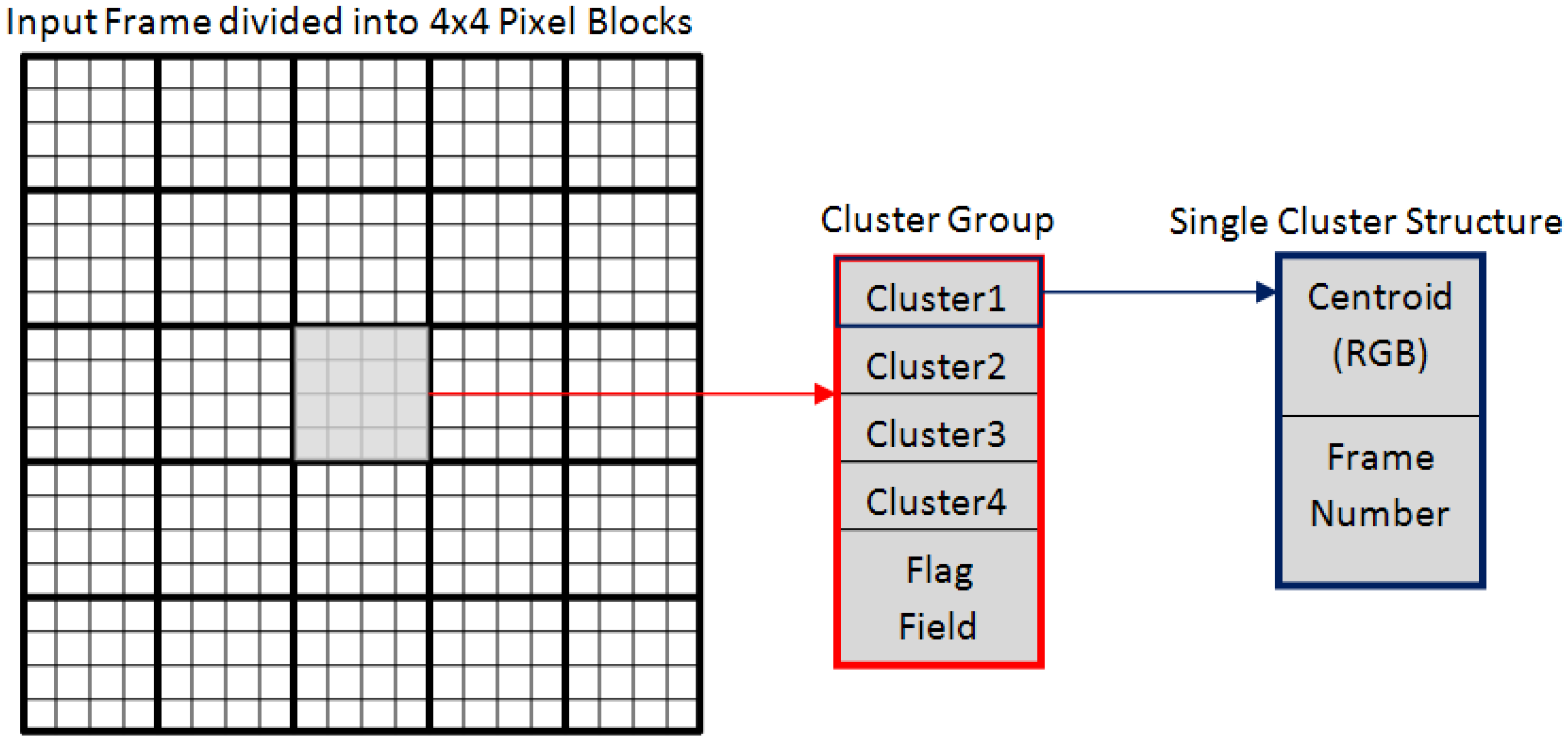 - Block Centroid Computation: Each incoming frame is partitioned into 4 × 4 blocks. For each block, the block centroid for RGB color space is computed by taking the average color value of the 16 pixels of that block. The block centroid is of 24-bits (8-bits for each R, G, and B color component).