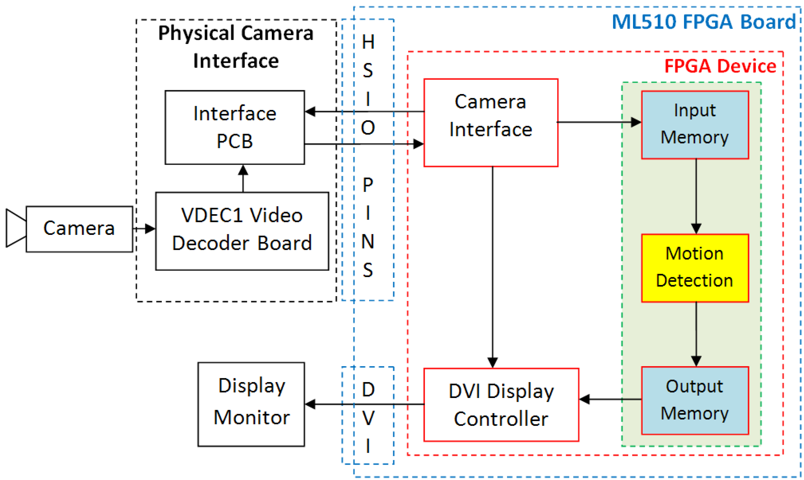 Input video, captured by a Sony Analog Camera, is digitized by Digilent VDEC1 Video Decoder Board. The digital output signals from the video decoder board are transferred to FPGA platform using high speed I/O ports (HSIO PINS) available on Xilinx ML510 (Virtex-5 FX130T) FPGA Board using custom designed Interface PCB. The components inside dashed blue line are available on Xilinx ML510 (Virtex-5 FX130T) FPGA Board. These include FPGA Device (shown by dashed red line), High Speed Input Output Interface (HSIO PINS), and DVI Interface. The Camera Interface module uses the digital video signals available at the FPGA interface and extracts RGB data and generates Video Timing Signals. The DVI Display Controller is used to display the processed data on Display Monitor.